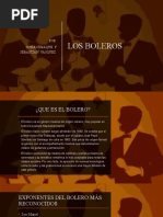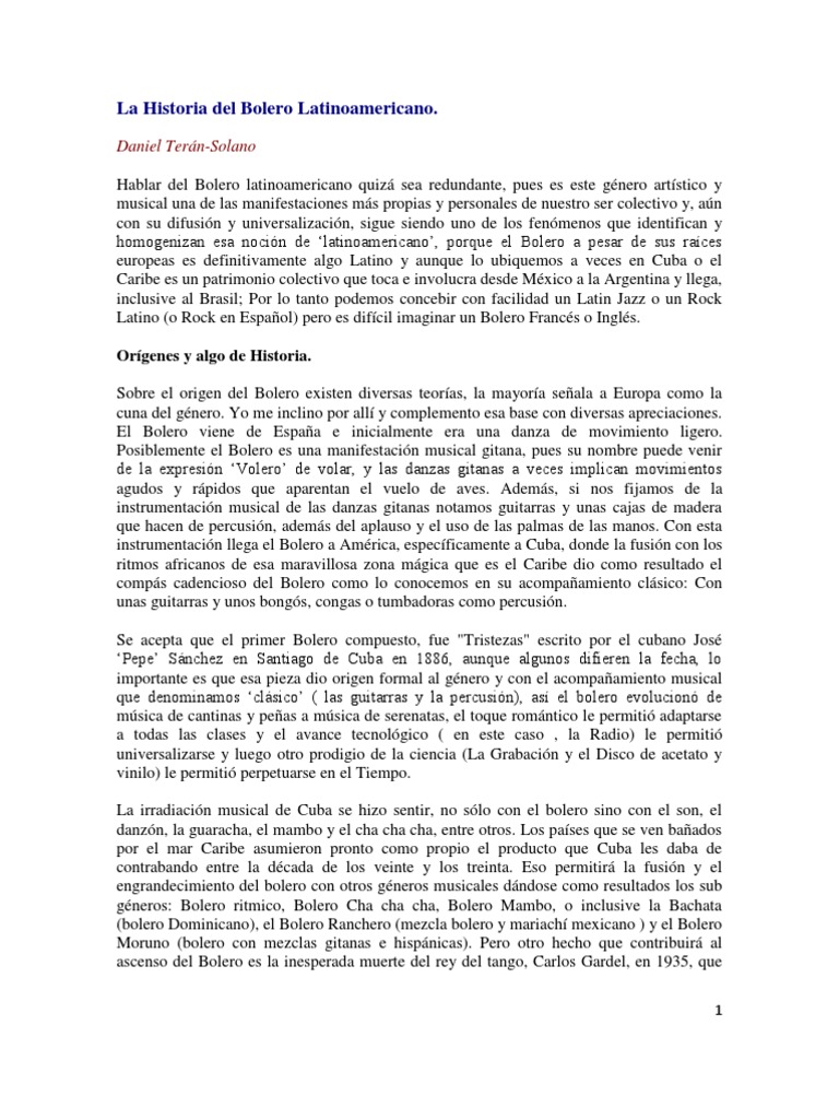 Daniel Tern-Solano Hablar del Bolero latinoamericano quiz sea redundante, pues es este gnero artstico y musical una de las manifestaciones ms propias y personales de nuestro ser colectivo y, an con su difusin y universalizacin, sigue siendo uno de los fenmenos que identifican y homogenizan esa nocin de latinoamericano, porque el Bolero a pesar de sus races europeas es definitivamente algo Latino y aunque lo ubiquemos a veces en Cuba o el Caribe es un patrimonio colectivo que toca e involucra desde Mxico a la Argentina y llega, inclusive al Brasil; Por lo tanto podemos concebir con facilidad un Latin Jazz o un Rock Latino (o Rock en Espaol) pero es difcil imaginar un Bolero Francs o Ingls. Orgenes y algo de Historia. Sobre el origen del Bolero existen diversas teoras, la mayora seala a Europa como la cuna del gnero. Yo me inclino por all y complemento esa base con diversas apreciaciones. El Bolero viene de Espaa e inicialmente era una danza de movimiento ligero. Posiblemente el Bolero es una manifestacin musical gitana, pues su nombre puede venir de la expresin Volero de volar, y las danzas gitanas a veces implican movimientos agudos y rpidos que aparentan el vuelo de aves. Adems, si nos fijamos de la instrumentacin musical de las danzas gitanas notamos guitarras y unas cajas de madera que hacen de percusin, adems del aplauso y el uso de las palmas de las manos. Con esta instrumentacin llega el Bolero a Amrica, especficamente a Cuba, donde la fusin con los ritmos africanos de esa maravillosa zona mgica que es el Caribe dio como resultado el comps cadencioso del Bolero como lo conocemos en su acompaamiento clsico: Con unas guitarras y unos bongs, congas o tumbadoras como percusin. Se acepta que el primer Bolero compuesto, fue "Tristezas" escrito por el cubano Jos Pepe Snchez en Santiago de Cuba en 1886, aunque algunos difieren la fecha, lo importante es que esa pieza dio origen formal al gnero y con el acompaamiento musical que denominamos clsico ( las guitarras y la percusin), as el bolero evolucion de msica de cantinas y peas a msica de serenatas, el toque romntico le permiti adaptarse a todas las clases y el avance tecnolgico ( en este caso , la Radio) le permiti universalizarse y luego otro prodigio de la ciencia (La Grabacin y el Disco de acetato y vinilo) le permiti perpetuarse en el Tiempo. La irradiacin musical de Cuba se hizo sentir, no slo con el bolero sino con el son, el danzn, la guaracha, el mambo y el cha cha cha, entre otros. Los pases que se ven baados por el mar Caribe asumieron pronto como propio el producto que Cuba les daba de contrabando entre la dcada de los veinte y los treinta. Eso permitir la fusin y el engrandecimiento del bolero con otros gneros musicales dndose como resultados los sub gneros: Bolero ritmico, Bolero Cha cha cha, Bolero Mambo, o inclusive la Bachata (bolero Dominicano), el Bolero Ranchero (mezcla bolero y mariach mexicano ) y el Bolero Moruno (bolero con mezclas gitanas e hispnicas). Pero otro hecho que contribuir al ascenso del Bolero es la inesperada muerte del rey del tango, Carlos Gardel, en 1935, que