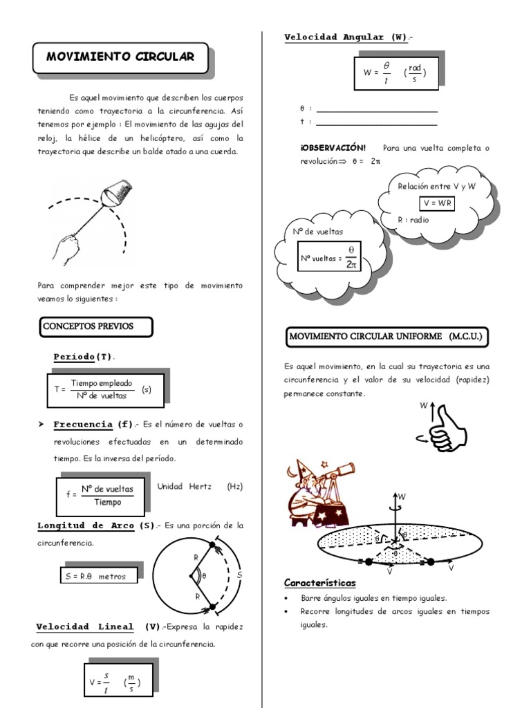 W= Es aquel movimiento que describen los cuerpos teniendo como trayectoria a la circunferencia. As tenemos por ejemplo : El movimiento de las agujas del reloj, la hlice de un helicptero, as como la trayectoria que describe un balde atado a una cuerda.