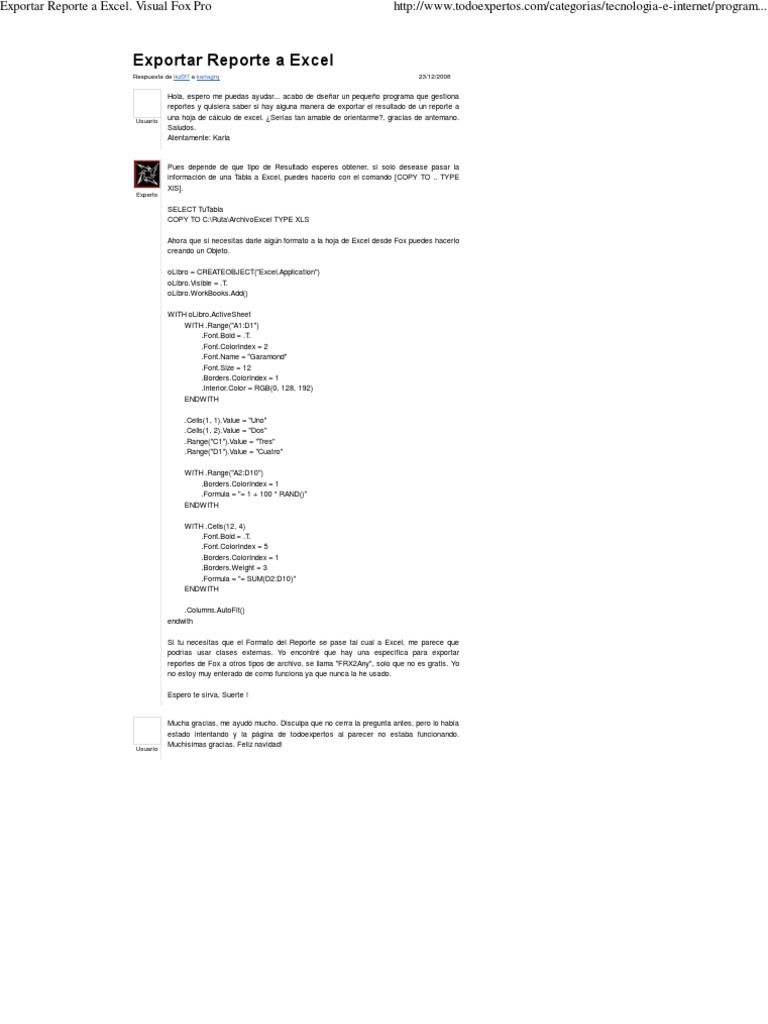 SELECT TuTabla COPY TO C:\Ruta\ArchivoExcel TYPE XLS Ahora que si necesitas darle algn formato a la hoja de Excel desde Fox puedes hacerlo creando un Objeto. oLibro = CREATEOBJECT("Excel.Application") oLibro.Visible = .T. oLibro.WorkBooks.Add() WITH oLibro.ActiveSheet WITH .Range("A1:D1") .Font.Bold = .T. .Font.ColorIndex = 2 .Font.Name = "Garamond" .Font.Size = 12 .Borders.ColorIndex = 1 .Interior.Color = RGB(0, 128, 192) ENDWITH .Cells(1, 1).Value = "Uno" .Cells(1, 2).Value = "Dos" .Range("C1").Value = "Tres" .Range("D1").Value = "Cuatro" WITH .Range("A2:D10") .Borders.ColorIndex = 1 .Formula = "= 1 + 100 * RAND()" ENDWITH WITH .Cells(12, 4) .Font.Bold = .T. .Font.ColorIndex = 5 .Borders.ColorIndex = 1 .Borders.Weight = 3 .Formula = "= SUM(D2:D10)" ENDWITH .Columns.AutoFit() endwith Si tu necesitas que el Formato del Reporte se pase tal cual a Excel, me parece que podras usar clases externas. Yo encontr que hay una especifica para exportar reportes de Fox a otros tipos de archivo, se llama "FRX2Any", solo que no es gratis. Yo no estoy muy enterado de como funciona ya que nunca la he usado. Espero te sirva, Suerte !