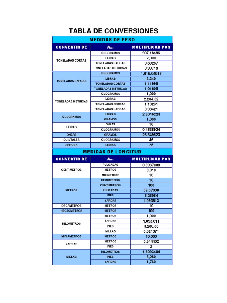 TABLA DE CONVERSIONES