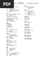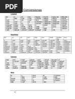 1 [Link] (KWh) = 3,60 x 106 J 1 electron voltio = 1,60 x 10 -19 J Fuerza 1 onza = 28,349 gramos 1 libra = 453,592 gramos 1 Newton = 105 dinas = 0,2248 libras 1libra = 4,448 N 1 tonelada = 2000 libras Potencia 1 watt (W) = 1 J/s 1 Ergio/s = 0,0000001 watt 1 HP = 0,746 kilowatt (KW) Unidades de Masa 1 Tonelada = 1000 Kg 1 Quintal = 100 Kg 1 Gramo = 0,001 Kg Unidades de Tiempo Minuto (mn) = 60 s Hora (h) = 3600 s Dia (d) = 86400 s Unidades Calorificas Grado Farenheit (F) Grado Kelvin (K) (1,8 x C) + 32 = F (Farenheit) 0,555 (F - 32) = C (Celcius)