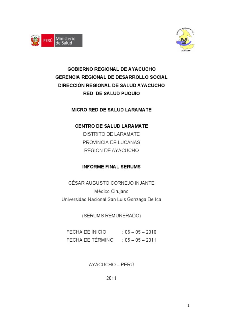 RED DE SALUD LARAMATE CENTRO DE SALUD LARAMATE DISTRITO DE LARAMATE PROVINCIA DE LUCANAS REGION DE AYACUCHO INFORME FINAL SERUMS CSAR AUGUSTO CORNEJO INJANTE Mdico Cirujano Universidad Nacional San Luis Gonzaga De Ica (SERUMS REMUNERADO) FECHA DE INICIO FECHA DE TRMINO : 06 05 2010 : 05 05 2011