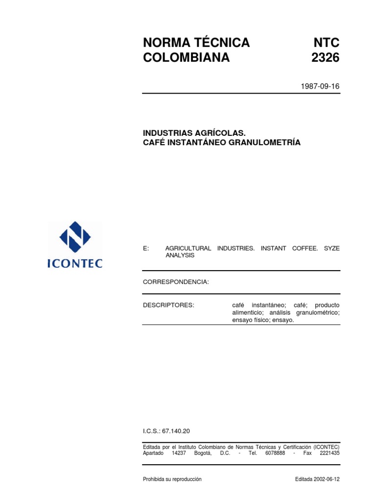 El Instituto Colombiano de Normas Tcnicas y Certificacin, ICONTEC, es el organismo nacional de normalizacin, segn el Decreto 2269 de 1993. ICONTEC es una entidad de carcter privado, sin nimo de lucro, cuya Misin es fundamental para brindar soporte y desarrollo al productor y proteccin al consumidor. Colabora con el sector gubernamental y apoya al sector privado del pas, para lograr ventajas competitivas en los mercados interno y externo. La representacin de todos los sectores involucrados en el proceso de Normalizacin Tcnica est garantizada por los Comits Tcnicos y el perodo de Consulta Pblica, este ltimo caracterizado por la participacin del pblico en general. La NTC 2326 fue ratificada por el Consejo Directivo de 1987-09-16. Esta norma est sujeta a ser actualizada permanentemente con el objeto de que responda en todo momento a las necesidades y exigencias actuales. En Consulta Pblica el Proyecto se puso a consideracin de las siguientes empresas: