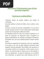 000 aos que el incienso arde sin llama en los altares de los magos. Antiguamente se quemaba para disimular el olor del animal sacrificado, para dirigir oraciones a los dioses, y para crear un ambiente propicio para el encuentro del hombre con la Divinidad. Actualmente, cuando la poca en que los magos de Occidente sacrificaban animales est ya muy lejana, se utiliza incienso por diversas razones. Se quema al hacer magia con el fin de estimular la conciencia ritual, es decir, el estado de nimo preciso para despertar y dirigir la energa personal. Este estado de nimo tambin se alcanza mediante la utilizacin de instrumentos mgicos, permaneciendo en pie ante el altar encantado donde arden las velas, entonando cnticos y pronunciando palabras simblicas. Cuando el incienso se quema con anterioridad a las operaciones mgicas, su humo perfumado purifica tambin el altar y el rea circundante, alejando las vibraciones perturbadoras y negativas. Aunque tal purificacin generalmente no es necesaria, ayuda a tener el estado anmico adecuado para alcanzar el xito en las operaciones mgicas. Se queman inciensos con formulaciones especiales con el fin de atraer ciertas energas especficas hasta el mago y ayudarlo/la a cargar su poder personal con el objetivo del rito, para producir finalmente el cambio necesario. La utilizacin de inciensos no debe limitarse exclusivamente a los ritos. Ahora bien, no utilice inciensos curativos simplemente por su perfume o como ambientadores del hogar. El hecho de quemar inciensos que han sido elaborados mgicamente y cargados de poder, cuando no se necesita hacerlo, constituye un gasto intil de energa. Si desea quemar un incienso que tenga un olor agradable, prepare una mezcla para uso domstico.