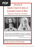 Papa Len XIII - Llam a la devocin al Sagrado Corazn de Jess una forma excelentsima de la religin... Esta devocin que Nos recomendamos, ser provechosa para todos. Papa Len XIII - En el Sagrado Corazn est el smbolo y la imagen expresa del Amor Infinito de Jesucristo que nos mueve a amarlo en correspondencia. Papa Po XII - Su Corazn es el signo natural y el smbolo de Su Amor Ilimitado por la raza humana. Papa San Gregorio Magno - ( a.D. 604) dijo, Aprendan del Corazn de Dios en las palabras de Dios para que puedan desear ardientemente las cosas eternas. Papa San Po X - recomend esta devocin, como lo hizo el Papa Po XI y el Beato Papa Po IX. Muchos Santos nos recomiendan esta devocin: El ejemplo de los santos es al mismo tiempo un motivo poderoso para urgirnos a la prctica de una devocin que ellos mismos practicaron. Su ejemplo es una gua segura para mostrarnos como practicarla. El espacio no nos permite listar a todos los santos que promovieron la devocin al Sagrado Corazn, quienes la vivieron, y sintieron su impulso Sagrado para amar ms ardientemente a Jess. Recordemos la doctrina y el ejemplo de los Santos. Santa Gertrudis la Magna - (1256-1302) compuso esta oracin ejemplificando su amor: Te saludo Oh Sagrado Corazn de Jess, fuente viviente y vivificante de vida eterna. Tesoro infinito de la Divinidad, Ardiente Hoguera de Amor Divino... Santa Catalina de Siena - am esta devocin (al Sagrado Corazn de Jess) a un grado extraordinario; ella hizo ntegra donacin de su corazn a su Divino Esposo y obtuvo a cambio el Corazn de Jess. San Francisco de Ass, Santo Toms, Santa Teresa de Avila, San Buenaventura, San Ignacio de Loyola, San Francisco Javier, San Felipe Neri, San Francisco de Sales, San Luis Gonzaga, - a los que han ledo las vidas y obras de los Santos, les ser posible ver la tierna devocin, admiracin y adoracin que tuvieron por el Sagrado Corazn. Pero sobre todo, recordemos la vida y las revelaciones del Sagrado Corazn a Santa Margarita Mara Alacoque en Paray-le-Monial. Ella recibi, entre otras cosas, las Doce Promesas del Sagrado Corazn de Jess. (ver pgina siguiente) Respecto a las bases para la devocin al Inmaculado Corazn de Mara, ver pgina 17 y ss. de este librito. Las Doce Promesas del Sagrado Corazn de Jess a las familias que lo honren 1. Les dar todas las gracias necesarias a su estado de vida. 2. Pondr la paz en sus familias. 3. Bendecir todas las casas en las que sea expuesto y honrado el cuadro de Mi Corazn. 4. Los consolar en todas sus aflicciones. 5. Ser su amparo durante la vida y especialmente en la hora de la muerte. 6. Derramar abundantes bendiciones sobre todas sus empresas. 7. Los pecadores encontrarn en Mi Corazn una fuente y ocano sin lmites de misericordia. 8. Las almas tibias se volvern fervorosas. 9. Las almas fervorosas se elevarn rpidamente a una gran perfeccin. [Link] a los sacerdotes el poder de conmover a los corazones ms endurecidos. [Link] que propaguen esta devocin tendrn sus nombres escritos en Mi Corazn para no ser borrados nunca de El. [Link] prometo, en la excesiva misericordia de Mi Corazn, que Mi amor todopoderoso dar a todos los