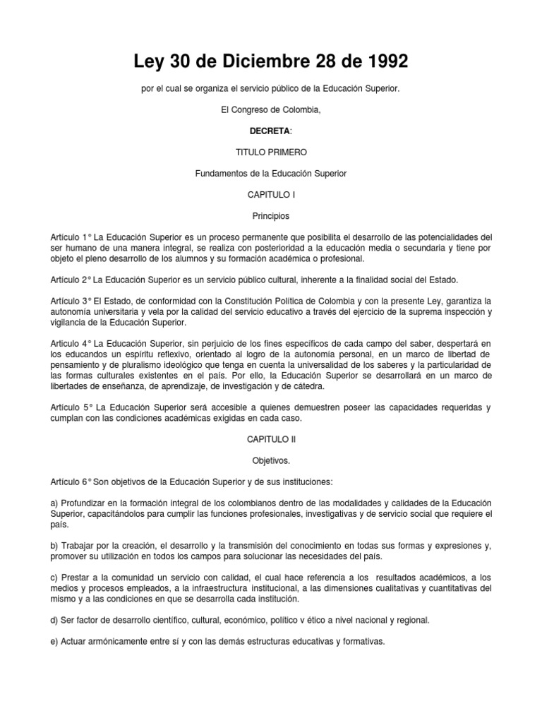 por el cual se organiza el servicio pblico de la Educacin Superior. El Congreso de Colombia, DECRETA: TITULO PRIMERO Fundamentos de la Educacin Superior CAPITULO I Principios Artculo 1 La Educacin Superior es un proceso permanente que posibilita el desarrollo de las potencialidades del ser humano de una manera integral, se realiza con posterioridad a la educacin media o secundaria y tiene por objeto el pleno desarrollo de los alumnos y su formacin acadmica o profesional. Artculo 2 La Educacin Superior es un servicio pblico cultural, inherente a la finalidad social del Estado. Artculo 3 El Estado, de conformidad con la Constitucin Poltica de Colombia y con la presente Ley, garantiza la autonoma universitaria y vela por la calidad del servicio educativo a travs del ejercicio de la suprema inspeccin y vigilancia de la Educacin Superior. Articulo 4 La Educacin Superior, sin perjuicio de los fines especficos de cada campo del saber, despertar en los educandos un espritu reflexivo, orientado al logro de la autonoma personal, en un marco de libertad de pensamiento y de pluralismo ideolgico que tenga en cuenta la universalidad de los saberes y la particularidad de las formas culturales existentes en el pas. Por ello, la Educacin Superior se desarrollar en un marco de libertades de enseanza, de aprendizaje, de investigacin y de ctedra. Artculo 5 La Educacin Superior ser accesible a quienes demuestren poseer las capacidades requeridas y cumplan con las condiciones acadmicas exigidas en cada caso. CAPITULO II Objetivos. Artculo 6 Son objetivos de la Educacin Superior y de sus instituciones: a) Profundizar en la formacin integral de los colombianos dentro de las modalidades y calidades de la Educacin Superior, capacitndolos para cumplir las funciones profesionales, investigativas y de servicio social que requiere el pas. b) Trabajar por la creacin, el desarrollo y la transmisin del conocimiento en todas sus formas y expresiones y, promover su utilizacin en todos los campos para solucionar las necesidades del pas. c) Prestar a la comunidad un servicio con calidad, el cual hace referencia a los resultados acadmicos, a los medios y procesos empleados, a la infraestructura institucional, a las dimensiones cualitativas y cuantitativas del mismo y a las condiciones en que se desarrolla cada institucin. d) Ser factor de desarrollo cientfico, cultural, econmico, poltico v tico a nivel nacional y regional. e) Actuar armnicamente entre s y con las dems estructuras educativas y formativas.