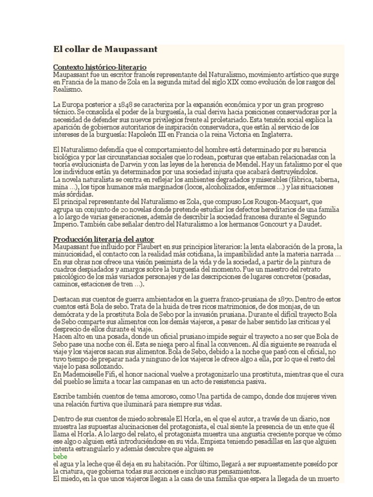 esa misma noche. De repente, el perro de la familia empieza a aullar y toda la gente de la casa empieza a experimentar gran terror y nerviosismo, hasta el punto de que el padre de la familia acaba disparando al perro. Escribe cuentos con un teln de fondo social como El collar, que trata del esfuerzo de una mujer con aspiraciones de grandeza por devolver a su amiga un collar que le haba prestado para una fiesta, pero que acab perdiendo. Ella y su marido compran un collar parecido. Para pagarlo trabajarn duramente y vivirn de manera muy humilde durante diez aos. El desenlace es un giro inesperado, pues la protagonista y la amiga del collar se encuentran y se descubre que la joya era realmente falsa. Aparece de fondo el tema social, pues se demuestra que el sueldo de los pequeos funcionarios es tan corto que apenas da para satisfacer las mnimas ilusiones de quien, como la seora Loisel, haba nacido para ser rica. Dentro de sus novelas destacan: Una vida, que narra las desilusiones de una mujer casada. Bel Ami, cuyo protagonista es un periodista sin escrpulos. Contenido del fragmento y relacionarlo con la totalidad de la obra El tema que predomina en todo el cuento es la insatisfaccin y vergenza de la protagonista por estar en una esfera social inferior a la que aspira. - Desde el principio del cuento, el narrador empieza sealando que la vida sencilla de la seora Loisel con un modesto empleado del Ministerio de Instruccin Pblica es desgraciada. Sufre contemplando la pobreza de su hogar y piensa en los grandes salones con finos muebles, en servicios de plata, en tapices De hecho, tiene una amiga a la que no va a ver con frecuencia por ser rica. - El marido llega con una invitacin del Ministerio para una fiesta y la seora Loisel llora porque no tiene vestido para ir a la fiesta. El marido accede a darle 400 francos para un vestido nuevo, pero sigue sin estar conforme porque no tiene ninguna joya. As pues, le pide prestado un collar a su amiga rica. - La seora Loisel se siente halagada y feliz porque se convierte en el centro de atencin en la fiesta. Todos los directores generales quieren bailar con ella. Al irse, la seora Loisel sale precipitadamente porque, avergonzada, no quiere que la vean con un abrigo modesto. Debido a esa precipitacin pierde el collar. - Compran uno semejante para devolvrselo a la amiga rica. Para pagarlo trabajarn duramente y vivirn de manera muy humilde durante diez aos. As, la protagonista fregar platos, subir el agua, regatear en las tiendas y sufrir insultos por ello. La protagonista se encuentra con su amiga rica. Orgullosa de haber conseguido pagar el collar, le confiesa la prdida de ste y la compra de otro igual. Sin embargo, la amiga le indica que el collar era falso. - Este desenlace inesperado aparece tambin en El corazn delator de Poe, cuando el protagonista percibe los latidos del anciano asesinado cada vez ms fuertes y confiesa su crimen ante los policas. - Las ansias de grandeza de la protagonista de El collar contrasta con el joven Vanka (en el cuento Vanka de Chjov) que anhela la vida sencilla de la aldea junto a su abuelo.