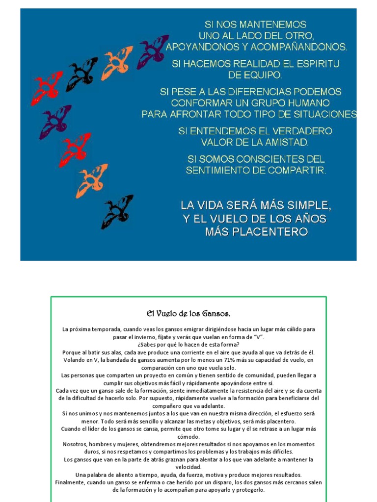 La prxima temporada, cuando veas los gansos emigrar dirigindose hacia un lugar ms clido para pasar el invierno, fjate y vers que vuelan en forma de V. Sabes por qu lo hacen de esta forma? Porque al batir sus alas, cada ave produce una corriente en el aire que ayuda al que va detrs de l. Volando en V, la bandada de gansos aumenta por lo menos un 71% ms su capacidad de vuelo, en comparacin con uno que vuela solo. Las personas que comparten un proyecto en comn y tienen sentido de comunidad, pueden llegar a cumplir sus objetivos ms fcil y rpidamente apoyndose entre s. Cada vez que un ganso sale de la formacin, siente inmediatamente la resistencia del aire y se da cuenta de la dificultad de hacerlo solo. Por supuesto, rpidamente vuelve a la formacin para beneficiarse del compaero que va adelante. Si nos unimos y nos mantenemos juntos a los que van en nuestra misma direccin, el esfuerzo ser menor. Todo ser ms sencillo y alcanzar las metas y objetivos, ser ms placentero. Cuando el lder de los gansos se cansa, permite que otro tome su lugar y l se retrase a un lugar ms cmodo. Nosotros, hombres y mujeres, obtendremos mejores resultados si nos apoyamos en los momentos duros, si nos respetamos y compartimos los problemas y los trabajos ms difciles. Los gansos que van en la parte de atrs graznan para alentar a los que van adelante a mantener la velocidad. Una palabra de aliento a tiempo, ayuda, da fuerza, motiva y produce mejores resultados. Finalmente, cuando un ganso se enferma o cae herido por un disparo, los dos gansos ms cercanos salen de la formacin y lo acompaan para apoyarlo y protegerlo.