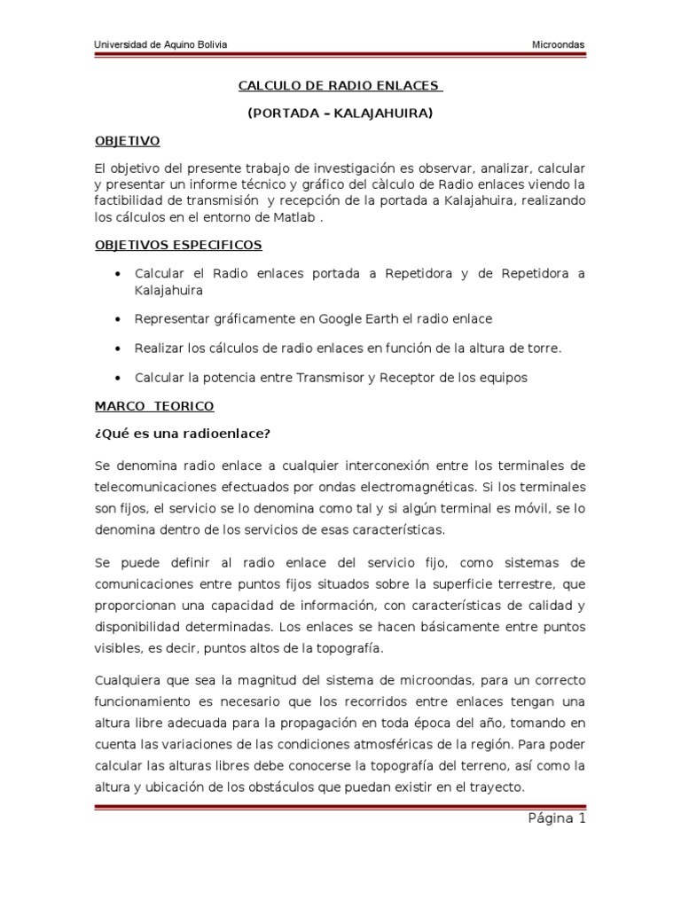 CALCULO DE RADIO ENLACES (PORTADA KALAJAHUIRA) OBJETIVO El objetivo del presente trabajo de investigacin es observar, analizar, calcular y presentar un informe tcnico y grfico del clculo de Radio enlaces viendo la factibilidad de transmisin y recepcin de la portada a Kalajahuira, realizando los clculos en el entorno de Matlab . OBJETIVOS ESPECIFICOS Calcular el Radio enlaces portada a Repetidora y de Repetidora a Kalajahuira Representar grficamente en Google Earth el radio enlace Realizar los clculos de radio enlaces en funcin de la altura de torre. Calcular la potencia entre Transmisor y Receptor de los equipos