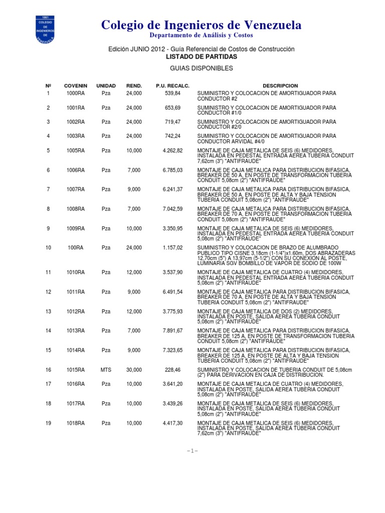 N 1 2 3 4 5 COVENIN 1000RA 1001RA 1002RA 1003RA 1005RA UNIDAD Pza Pza Pza Pza Pza REND. 24,000 24,000 24,000 24,000 10,000 P.U. RECALC. 539,84 653,69 719,47 742,24 4.262,82 DESCRIPCION SUMINISTRO Y COLOCACION DE AMORTIGUADOR PARA CONDUCTOR #2 SUMINISTRO Y COLOCACION DE AMORTIGUADOR PARA CONDUCTOR #1/0 SUMINISTRO Y COLOCACION DE AMORTIGUADOR PARA CONDUCTOR #2/0 SUMINISTRO Y COLOCACION DE AMORTIGUADOR PARA CONDUCTOR ARVIDAL #4/0 MONTAJE DE CAJA METALICA DE SEIS (6) MEDIDORES, INSTALADA EN PEDESTAL ENTRADA AEREA TUBERIA CONDUIT 7,62cm (3") "ANTIFRAUDE" MONTAJE DE CAJA METALICA PARA DISTRIBUCION BIFASICA, BREAKER DE 50 A, EN POSTE DE TRANSFORMACION TUBERIA CONDUIT 5,08cm (2") "ANTIFRAUDE" MONTAJE DE CAJA METALICA PARA DISTRIBUCION BIFASICA, BREAKER DE 50 A, EN POSTE DE ALTA Y BAJA TENSION TUBERIA CONDUIT 5,08cm (2") "ANTIFRAUDE" MONTAJE DE CAJA METALICA PARA DISTRIBUCION BIFASICA, BREAKER DE 70 A, EN POSTE DE TRANSFORMACION TUBERIA CONDUIT 5,08cm (2") "ANTIFRAUDE" MONTAJE DE CAJA METALICA DE SEIS (6) MEDIDORES, INSTALADA EN PEDESTAL ENTRADA AEREA TUBERIA CONDUIT 5,08cm (2") "ANTIFRAUDE" SUMINISTRO Y COLOCACION DE BRAZO DE ALUMBRADO PUBLICO TIPO CISNE 3,18cm (1-1/4")x1.60m, DOS ABRAZADERAS 12,70cm (5") A 13,97cm (5-1/2") CON SU CONEXION AL POSTE, LUMINARIA SGV BOMBILLO DE VAPOR DE SODIO DE 100W MONTAJE DE CAJA METALICA DE CUATRO (4) MEDIDORES, INSTALADA EN PEDESTAL ENTRADA AEREA TUBERIA CONDUIT 5,08cm (2") "ANTIFRAUDE" MONTAJE DE CAJA METALICA PARA DISTRIBUCION BIFASICA, BREAKER DE 70 A, EN POSTE DE ALTA Y BAJA TENSION TUBERIA CONDUIT 5,08cm (2") "ANTIFRAUDE" MONTAJE DE CAJA METALICA DE DOS (2) MEDIDORES, INSTALADA EN POSTE, SALIDA AEREA TUBERIA CONDUIT 5,08cm (2") "ANTIFRAUDE" MONTAJE DE CAJA METALICA PARA DISTRIBUCION BIFASICA, BREAKER DE 125 A, EN POSTE DE TRANSFORMACION TUBERIA CONDUIT 5,08cm (2") "ANTIFRAUDE" MONTAJE DE CAJA METALICA PARA DISTRIBUCION BIFASICA, BREAKER DE 125 A, EN POSTE DE ALTA Y BAJA TENSION TUBERIA CONDUIT 5,08cm (2") "ANTIFRAUDE" SUMINISTRO Y COLOCACION DE TUBERIA CONDUIT DE 5,08cm (2") PARA DERIVACION EN CAJA DE DISTRIBUCION. MONTAJE DE CAJA METALICA DE CUATRO (4) MEDIDORES, INSTALADA EN POSTE, SALIDA AEREA TUBERIA CONDUIT 5,08cm (2") "ANTIFRAUDE" MONTAJE DE CAJA METALICA DE SEIS (6) MEDIDORES, INSTALADA EN POSTE, SALIDA AEREA TUBERIA CONDUIT 5,08cm (2") "ANTIFRAUDE" MONTAJE DE CAJA METALICA DE SEIS (6) MEDIDORES, INSTALADA EN POSTE, SALIDA AEREA TUBERIA CONDUIT 7,62cm (3") "ANTIFRAUDE"