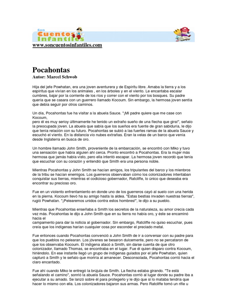 Hija del jefe Powhatan, era una joven aventurera y de Espritu libre. Amaba la tierra y a los espritus que vivan en los animales , en los rboles y en el viento. Le encantaba escalar cumbres, bajar por la corriente de los ros y correr con el viento por los bosques. Su padre quera que se casara con un guerrero llamado Kocoum. Sin embargo, la hermosa joven senta que deba seguir por otros caminos. Un da, Pocahontas fue ha visitar a la abuela Sauce. "Mi padre quiere que me case con Kocoum, pero l es muy serioy ltimamente he tenido un extrao sueo de una flecha que gira!", sealo la preocupada joven. La abuela que saba que los sueos era fuente de gran sabidura, le dijo que tena relacin con su futuro. Pocahontas se subi a las fuertes ramas de la abuela Sauce y escuch el viento. En la distancia vio nubes extraas. Eran la velas de un barco que vena desde Inglaterra en busca de oro. Un hombre llamado John Smith, proveniente de la embarcacin, se encontr con Miko y tuvo una sensacin que haba alguien ah cerca. Pronto encontr a Pocahontas. Era la mujer ms hermosa que jams haba visto, pero ella intent escapar. La hermosa joven record que tena que escuchar con su corazn y entendi que Smith era una persona noble. Mientras Pocahontas y John Smith se hacan amigos, los tripulantes del barco y los mienbros de la tribu se hacan enemigos. Los guerreros observaban cmo los colonizadores intentaban conquistar sus tierras, mientras el codicioso gobernador, Ratcliffe, lo nico que deseaba era encontrar su precioso oro. Fue en un violento enfrentamiento en donde uno de los guerreros cay al suelo con una herida en la pierna. Kocoum llev ha su amigo hasta la aldea. "Estas bestias invaden nuestras tierras", rugi Powhatan. "Pelearemos unidos contra estos hombres!", le dijo a su pueblo. Mientras que Pocahontas enseaba a Smith los secretos de la naturaleza, su amor creca cada vez ms. Pocahontas le dijo a John Smith que en su tierra no haba oro, y ste se encamin hacia el campamento para dar la noticia al gobernador. Sin embargo, Ratcliffe no quiso escuchar, pues crea que los indgenas haran cualquier cosa por esconder el preciado metal. Fue entonces cuando Pocahontas convenci a John Smith de ir a conversar con su padre para que los pueblos no pelearan. Los jvenes se besaron dulcemente, pero no se percataron de que los observaba Kocoum. El indgena atac a Smith, sin darse cuenta de que otro colonizador, llamado Thomas, se encontraba en el lugar. Fue l quien disparo contra Kocoum, hirindolo. En ese instante lleg un grupo de indgenas guiados por el jefe Powhatan, quien captur a Smith y le sealo que morira al amanecer. Desconsolada, Pocahontas corri hacia el claro encantado. Fue ah cuando Miko le entreg la brjula de Smith. La flecha estaba girando. "Te est sealando el camino", sonri la abuela Sauce. Pocahontas corri al lugar donde su padre iba a ejecutar a su amado. Se lanz sobre l para protegerlo y le dijo que si lo mataba tendra que hacer lo mismo con ella. Los colonizadores bajaron sus armas. Pero Ratcliffe tom un rifle u