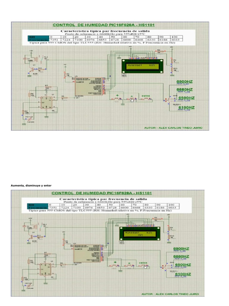 Informacin Proyecto Caractersticas: Control de humedad Rango 1% a 100% Humedad Relativa Sensor Humedad relativa HS1101 Visualizador Display lcd 16X2 Guarda datos de ajuste humedad en la eeprom Control Relay 12vdc Microcontrolador utilizado PIC16F628A