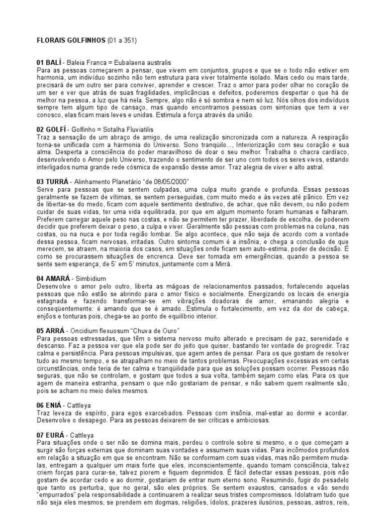 em conjuntos, grupos e que se o todo no estiver em harmonia, um indivduo sozinho no tem estrutura para viver totalmente isolado. Mais cedo ou mais tarde, precisar de um outro ser para conviver, aprender e crescer. Traz o amor para poder olhar no corao de um ser e ver que atrs de suas fragilidades, implicncias e defeitos, poderemos despertar o que h de melhor na pessoa, a luz que h nela. Sempre, algo no s sombra e nem s luz. Ns olhos dos indivduos sempre tem algum tipo de cansao, mas quando encontramos pessoas com sintonias que tem a ver conosco, elas ficam mais leves e unidas. Estimula a fora atravs da unio. 02 GOLF - Golfinho = Sotalha Fluviatilis Traz a sensao de um abrao de amigo, de uma realizao sincronizada com a natureza. A respirao torna-se unificada com a harmonia do Universo. Sono tranqilo..., Interiorizao com seu corao e sua alma. Desperta a conscincia do poder maravilhoso de doar o seu melhor. Trabalha o chacra cardaco, desenvolvendo o Amor pelo Universo, trazendo o sentimento de ser uno com todos os seres vivos, estando interligados numa grande rede csmica de expanso desse amor. Traz alegria de viver e alto astral. 03 TURR - Alinhamento Planetrio de 08/05/2000 Serve para pessoas que se sentem culpadas, uma culpa muito grande e profunda. Essas pessoas geralmente se fazem de vtimas, se sentem perseguidas, com muito medo e s vezes at pnico. Em vez de libertar-se do medo, ficam com aquele sentimento destrutivo, de achar, que no devem, ou no podem cuidar de suas vidas, ter uma vida equilibrada, por que em algum momento foram humanas e falharam. Preferem carregar aquele peso nas costas, e no se permitem ter prazer, liberdade de escolha, de poderem decidir que preferem deixar o peso, a culpa e viver. Geralmente so pessoas com problemas na coluna, nas costas, ou na nuca e por toda regio lombar. Se algo acontece, que no seja de acordo com a vontade dessa pessoa, ficam nervosas, irritadas. Outro sintoma comum a insnia, e chega a concluso de que merecem, se atraem, na maioria dos casos, em situaes onde ficam sem auto-estima, poder de deciso. como se procurassem situaes de encrenca. Deve ser tomada em emergncias, quando a pessoa se sente sem esperana, de 5 em 5 minutos, juntamente com a Mirr. 04 AMAR - Simbidium Desenvolve o amor pelo outro, liberta as mgoas de relacionamentos passados, fortalecendo aquelas pessoas que no esto se abrindo para o amor fsico e socialmente. Energizando os locais de energia estagnada e fazendo transformar-se em vibraes doadoras de amor, emanando alegria e conseqentemente: amando que se amado...Estimula o fortalecimento, em vez da dor de cabea, enjos e tonturas pois, chega-se ao ponto de equilbrio interior. 05 ARR - Oncidium flexuosum Chuva de Ouro Para pessoas estressadas, que tm o sistema nervoso muito alterado e precisam de paz, serenidade e descanso. Faz a pessoa ver que ela pode ser do jeito que quiser, bastando ter vontade de progredir. Traz calma e persistncia. Para pessoas impulsivas, que agem antes de pensar. Para os que gostam de resolver tudo ao mesmo tempo, e se atrapalham no meio de tantos problemas. Preocupaes excessivas em certas circunstncias, onde teria de ter calma e tranqilidade para que as solues possam ocorrer. Pessoas no seguras, que no se controlam, e gostam que todos a sua volta, tambm sejam como elas. Para os que agem de maneira estranha, pensam o que no gostariam de pensar, e no sabem quem realmente so, pois se acham no meio deles mesmos. 06 ENI - Cattleya Traz leveza de esprito, para egos exarcebados. Pessoas com insnia, mal-estar ao dormir e acordar. Desenvolve o desapego. Para as pessoas deixarem de ser crticas e ambiciosas. 07 EUR - Cattleya Para situaes onde o ser no se domina mais, perdeu o controle sobre si mesmo, e o que comeam a surgir so foras externas que dominam suas vontades e assumem suas vidas. Para incmodos profundos em relao a situao em que se encontram. No se conformam com suas vidas, mas no permitem mudalas, entregam a qualquer um mais forte que eles, inconscientemente, quando tomam conscincia, talvez criem foras para curar-se, talvez piorem e fiquem deprimidos. fcil detectar essas pessoas, pois no gostam de acordar cedo e ao dormir, gostariam de entrar num eterno sono. Resumindo, fugir do pesadelo que tanto os perturba, que no geral, so eles prprios. Se sentem exaustos, cansados e vo sendo empurrados pela responsabilidade a continuarem a realizar seus tristes compromissos. Idolatram tudo que no seja eles mesmos, se prendem em dogmas, religies, dolos, prazeres ilusrios, pessoas, astros, reis,