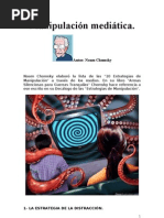 D) Los Procedimientos Estratgicos Hay diversos medios para dominar al pueblo sin que ste se d cuenta. Pongamos un ejemplo; en l yo no miento pero manipulo. Tres personas hablan mal de una cuarta, y yo le cuento a sta exactamente lo que me han dicho, pero altero un poco el lenguaje. En vez de decir que tales personas en concreto han dicho esto, indico que lo dice la gente. Paso del singular al colectivo. Con ello no slo le infundo miedo a esa persona sino angustia, que es un sentimiento mucho ms difuso y penoso. El miedo es temor ante algo adverso que te hace frente de manera abierta y te permite tomar medidas. La angustia es un miedo envolvente. No sabes a dnde acudir. Dnde est la gente que te ataca con su maledicencia? La gente es una realidad annima, envolvente, a modo de niebla que te bloquea. Te sientes angustiado. Tal angustia es provocada por el fenmeno sociolgico del rumor, que suele ser tan poderoso como cobarde debido a su anonimato. "Se dice que tal ministro realiz una evasin de capitales". Quin lo dice? La gente, es decir, nadie concreto y potencialmente todos. Otra forma oblicua, sesgada, subrepticia, de vencer al pueblo sin preocuparse de convencerlo es la de repetir una vez y otra, a travs de los medios de comunicacin, ideas o imgenes cargadas de intencin ideolgica. No se entra en cuestin, no se demuestra nada, no se va al fondo de los problemas. Sencillamente se lanzan proclamas, se hacen afirmaciones contundentes, se propagan eslganes a modo de sentencias cargadas de sabidura. Este bombardeo diario configura la opinin pblica, porque la gente acaba tomando lo que se afirma como lo que todos piensan, como aquello de que todos hablan, como lo que se lleva, lo actual, lo normal, lo que hace norma y se impone. Una de las metas del demagogo es anular, de una forma u otra, a quienes pueden descubrir sus trampas, sus trucos de ilusionista. Segn Anatole France, "una necedad repetida por muchas bocas no deja de ser una necedad". Ciertamente, mil mentiras no hacen una sola verdad Pero Una mentira o una media verdad repetida por un medio poderoso de comunicacin se convierte en una verdad de hecho Extractos de: "La Manipulacin del Hombre a travs del Lenguaje" de Alfonso Lpez Quints. Extrado de [Link] [Link]