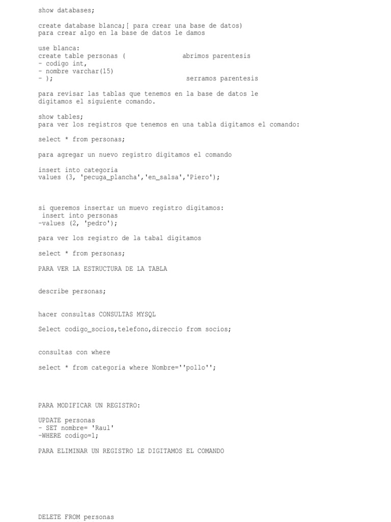 si queremos insertar un muevo registro digitamos: insert into personas -values (2, 'pedro'); para ver los registro de la tabal digitamos select * from personas; PARA VER LA ESTRUCTURA DE LA TABLA describe personas; hacer consultas CONSULTAS MYSQL Select codigo_socios,telefono,direccio from socios; consultas con where select * from categoria where Nombre=''pollo'';