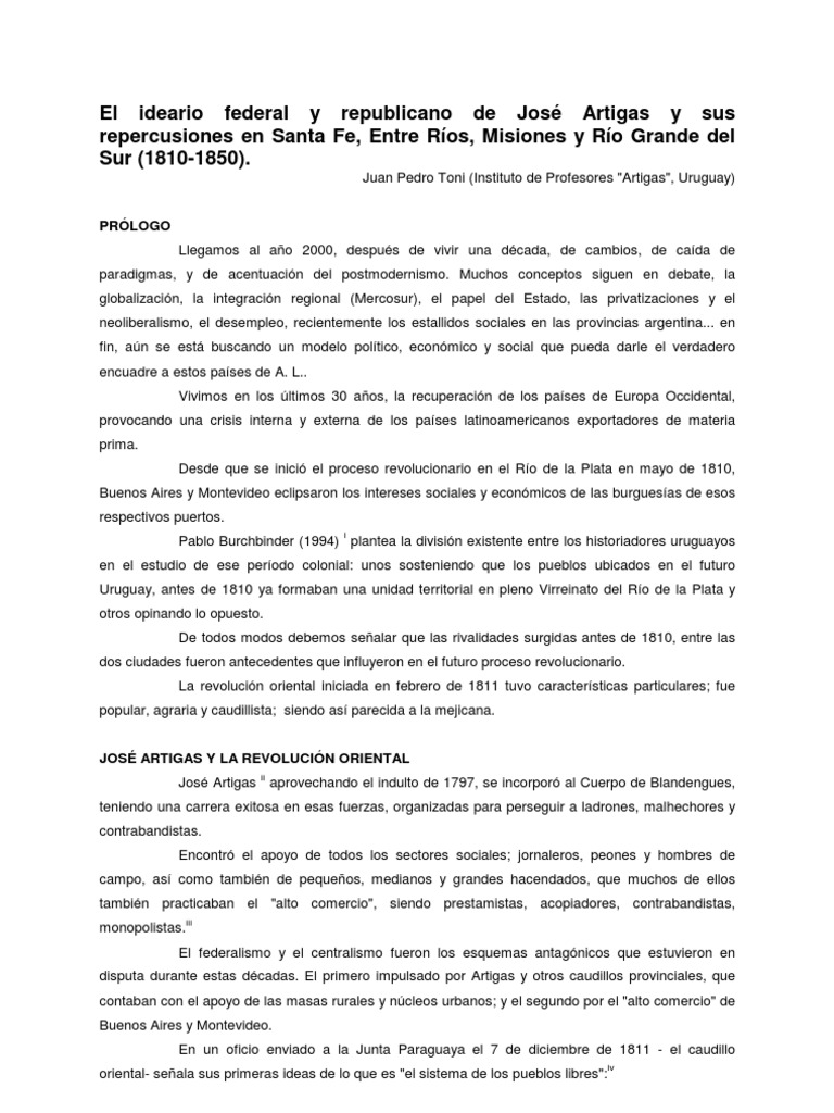 Instrucciones a Garca de Ziga enero de 1813 en Ob. Cit. p. 89 Instrucciones del ao XIII, 13 de abril de 1813 en Ob. Cit. p.96 xiv Frega Ana "La virtud y el poder. La soberana particular de los pueblos en el proyecto artiguista" en Goldman, Noem - Salvatore Ricardo "Caudillismos Rioplatenses" Eudeba. Buenos Aires, 1998. P. 121. xv "por un lado se van aglutinando los ncleos criollos antimonopolistas, mientras que por otro se descomponen las fuerzas espaolas y monopolistas. (...) En esta rpida secuencia que finalmente desembocar en la Revolucin, el gran tema es el del poder, que clase o agrupamiento de clases comandar el Estado." Sala de Touron Luca, De la Torre Nelson, Rodrguez Julio "Estructura Econmico-social de la Colonia" Ediciones Pueblos Unidos. Montevideo. 1967. P.176 a 182. xvi Botana Natalio, Luna Felix "Dilogos con la historia y la poltica" Editorial Sudamericana. Buenos Aires. 1995 p.162. xvii Eugenio Petit Muoz (1960) analizando la federacin planteada por Artigas indica que "...el proceso poltico concebido por Artigas supona que el Ro de la Plata recorriera a las siguientes etapas: 1 etapa de la revolucin: soberana particular de los pueblos. 2 etapa de la integracin (palabra que proponemos para caracterizarla): los pueblos, mediante un primer pacto, constituyen provincias, que absorben las soberanas particulares. 3 etapa del pacto: las Provincias, celebrando entr e s pactos o ligas, crearan una Confederacin, que dejara a cada provincia como soberana, delegando en el "Soberano Congreso General de la Nacin", solamente la gestin de las relaciones exteriores, guerra y comercio, como lo hicieron al confederarse los Estados norteamericanos. 4 etapa de la constitucin; esta etapa sobrevendra "terminada la guerra", como se expresa en el proyecto de tratado entre Artigas y los delegados del Director Supremo Posadas, (...) y la constitucin organizara un Estado Federal, es decir, que refundira en una sola soberana, las hasta entonces diferentes soberanas provinciales".Petit Muoz, Eugenio "Valoracin de Artigas" en "Artigas" Ediciones de "El Pas". Mdeo. 1960 p. 266 xviii Acta del Congreso de Abril , Banda Oriental, 5 de abril de 1813 en Ob. Cit. p.94. xix "la cada del rgimen espaol, la soberana y la representacin correspondieron al mbito municipal. ste asumi los poderes de otras autoridades e instituciones coloniales desplazadas por la revolucin. (...) el trmino pueblo no era manejado en su acepcin moderna, tampoco lo fue el de representante o diputados eran entendidos como apoderados (...) deban actuar segn instrucciones precisas y en permanente consulta con quienes les haban conferido el poder."Frega Ana "Los pueblos y la construccin del Estado en el crisol de la Revolucin" en Cuadernos del Claeh No. 69.1994 P .52 xx Reyes Abadie, Washington "Visin geopoltica de Artigas" en Geopoltica . Montevideo. 1977. P. 11. xxi Ob. Cit. p. 53 xxii Ob. Cit. p. 53 xxiii Ob. Cit. p.118 xxiv Reyes Abadie Washington y otros "Las races de la integracin federal" en Cuadernos de Marcha No.4 agosto, 1967. P.12. xxv Ob. Cit. p. 13. xxvi Artigas lo manifiesta desde su Cuartel General el 29 de marzo de 1814: "Todos los pueblos a lo largo del Uruguay y del Paran estn bajo un mismo pie de reforma y han saludado el restablecimiento de la armona general, de la prosperidad, la vida y la paz, y la libertad... y luego que se fije en todo el territorio el plan de su seguridad, se verificar la organizacin, consultando cada una de las provincias todas sus ventajas peculiares y respectivas, y quedarn todas en una perfecta unin entre s mismas; no en aquella unin mezquina que obliga a cada pueblo a desprenderse de una parte de su confianza en cambio de una obediencia servil, sino en aquella unin que hace al inters mismo, sin perjuicio de los derechos de los pueblos, y de su libre y entero ejercicio".Oficio al Cabildo de Corrientes con motivo del movimiento federal den dicha Provincia en "Artigas" de Oscar Bruschera. Biblioteca de Marcha. Coleccin Los Nuestros/1. Montevideo. 1967. P. 122. xxvii Relato del Coronel Ramn de Cceres en Cuadernos de Marcha, 19 de junio de 1964. Montevideo. p.15 xxviii Ob. Cit. p. 463. xxix Molinari Diego Luis "Viva Ramrez". Buenos Aires. 1938. P. 187. xxx Por un lado la historiografa argentina, interpreta que: "Ramrez iba hasta ese momento en carcter de representante de Artigas, pero la derrota decisiva del caudillo oriental en Tacuaremb le movi a obrar por cuenta propia, dejando de lado instrucciones que le haba dado Artigas. Cuenta Mansilla, oficial porteo que intim con Ramrez durante los preparativos del Tratado del Pilar, que le expres sus dudas acerca de que Artigas lo aprobase, a lo que contest Ramrez, que si no aprobaba lo peleara."Saldas Adolfo "Historia de Rosas y su poca ". Ed. Lajouane. Bs. As. 1887. T.1 p.33.