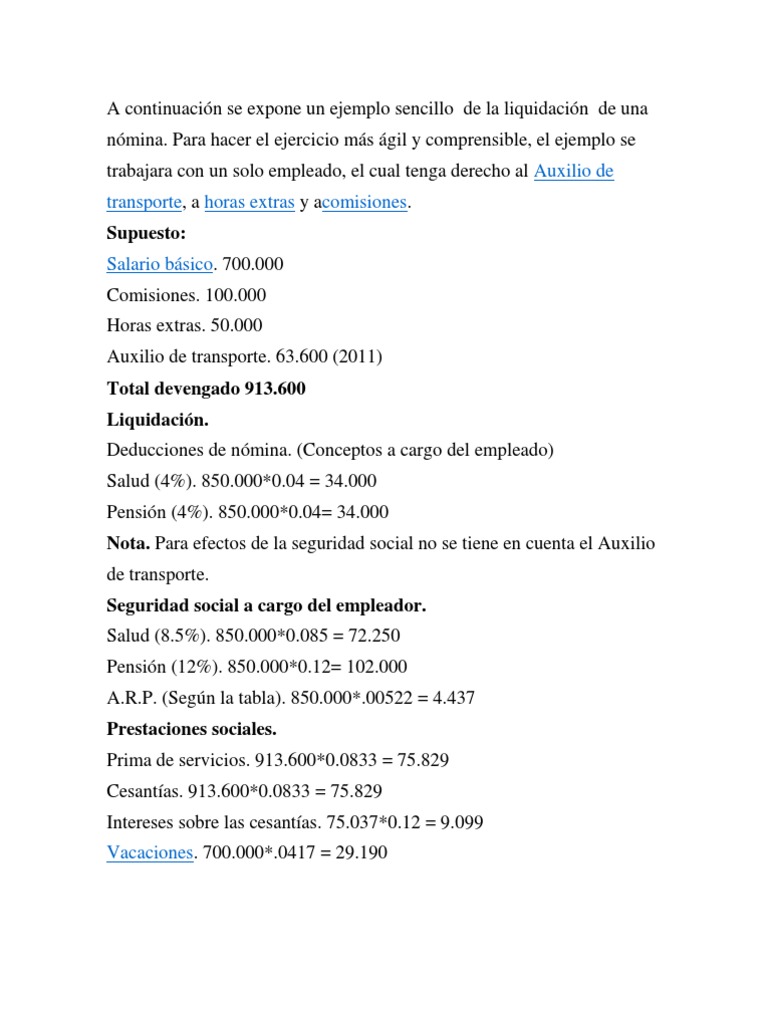 Para hacer el ejercicio ms gil y comprensible, el ejemplo se trabajara con un solo empleado, el cual tenga derecho al Auxilio de transporte, a horas extras y acomisiones. Supuesto: Salario bsico. 700.000 Comisiones. 100.000 Horas extras. 50.000 Auxilio de transporte. 63.600 (2011) Total devengado 913.600 Liquidacin. Deducciones de nmina. (Conceptos a cargo del empleado) Salud (4%). 850.000*0.04 = 34.000 Pensin (4%). 850.000*0.04= 34.000 Nota. Para efectos de la seguridad social no se tiene en cuenta el Auxilio de transporte. Seguridad social a cargo del empleador. Salud (8.5%). 850.000*0.085 = 72.250 Pensin (12%). 850.000*0.12= 102.000 A.R.P. (Segn la tabla). 850.000*.00522 = 4.437 Prestaciones sociales. Prima de servicios. 913.600*0.0833 = 75.829 Cesantas. 913.600*0.0833 = 75.829 Intereses sobre las cesantas. 75.037*0.12 = 9.099 Vacaciones. 700.000*.0417 = 29.190