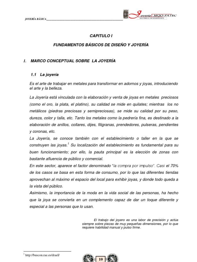 1.1 La joyera Es el arte de trabajar en metales para transformar en adornos y joyas, introduciendo el arte y la belleza. La Joyera est vinculada con la elaboracin y venta de joyas en metales preciosos (como el oro, la plata, el platino), su calidad se mide en quilates; mientras los no metlicos (piedras preciosas y semipreciosas), se mide su calidad por su peso, dureza, color y talla, etc. Tanto los metales como la pedrera fina, es destinado a la elaboracin de anillos, collares, dijes, filigranas, prendedores, pulseras, pendientes y coronas, etc. La Joyera, se conoce tambin con el establecimiento o taller en la que se construyen las joyas.1 Su localizacin del establecimiento es fundamental para su buen funcionamiento; por ello, la pauta principal es la eleccin de zonas con bastante afluencia de pblico y comercial. En este sector, aparece el factor denominado la compra por impulso. Casi el 70% de los casos se basa en esta forma de consumo, por lo que las diferentes tiendas aprovechan al mximo el espacio del local para exhibir joyas, y donde todo queda a la vista del pblico. Asimismo, la importancia de la moda en la vida social de las personas, ha hecho que la joya se convierta en un complemento capaz de dar un toque diferente y especial a las personas que lo usan.
