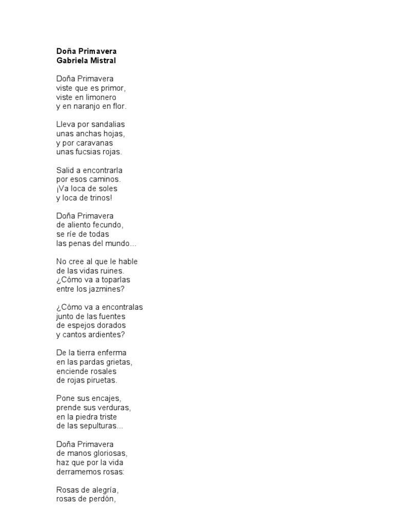 Doa Primavera Gabriela Mistral Doa Primavera viste que es primor, viste en limonero y en naranjo en flor.