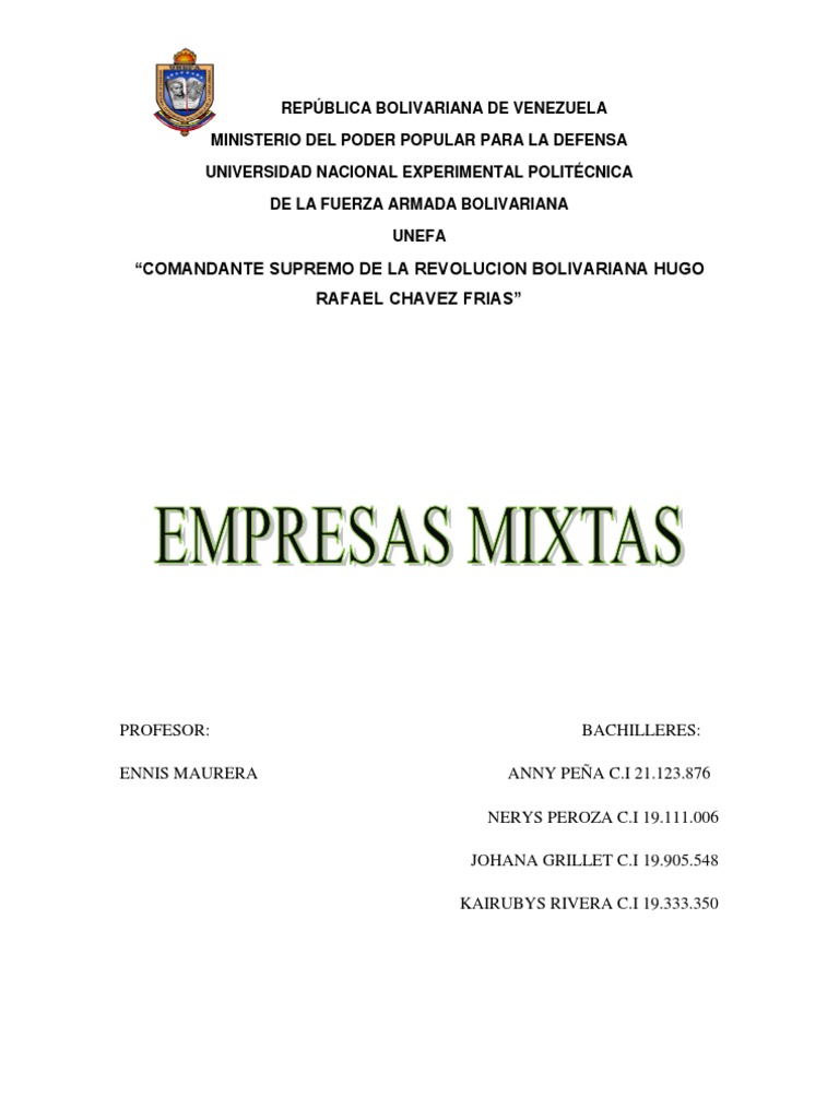 EMPRESAS MIXTAS Una empresa mixta es un tipo de empresa que recibe aportes capitales por parte de particulares y por parte del estado etc. Por lo tanto no es una empresa de titularidad enteramente privada, ni enteramente pblica, sino mixta. La participacin de uno u otro en la gestin depender de los derechos y Acciones que tengan en la Empresa. CARACTERSTICAS Su caracterstica principal es la convivencia, dentro de la Sociedad privada, del Inters pblico con el inters privado. Son aquellas que se forman con la fusin de capital pblico y privado Su la forma de asociacin puede ser muy diversa, en algunos casos el capital pblico puede ser mayoritario, en otros es el capital privado el mayoritario, asimismo, la proporcin en que se combinen los capitales puede ser muy diversa. IMPORTANCIA Las Empresas Mixtas son de suma importancia ya que han permitido consolidarse de manera importante, logrando un mayor alcance y expansin en los mercados nacional e internacional. Por medio de las Empresas Mixtas se crean y desarrollan las Empresas de Produccin Social con el fin de fortalecer un nuevo modelo productivo, que permita conectar a Venezuela y garantizar que la distribucin de las riquezas del pas resuelvan los grandes problemas sociales. VENTAJAS Y DESVENTAJAS DE LAS EMPRESAS MIXTAS Las ventajas Proporcionar a las empresas la oportunidad de ganar experiencia y capacidad de nuevo Permitir a las empresas a entrar en negocios relacionados o nuevos mercados geogrficos o obtener nuevos conocimientos tecnolgicos Acceso a mayores recursos, incluyendo especializado personal y tecnologa Compartir riesgos con un socio de la empresa