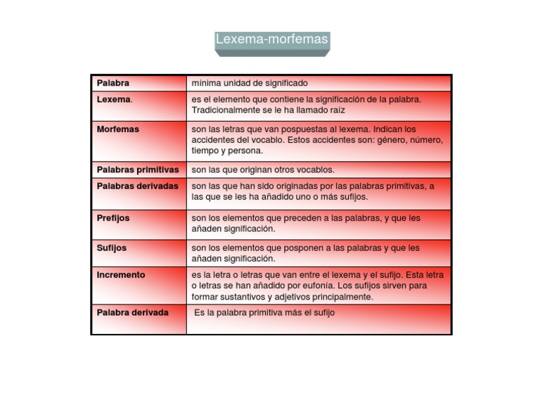 Palabra Lexema. Morfemas mnima unidad de significado es el elemento que contiene la significacin de la palabra. Tradicionalmente se le ha llamado raz son las letras que van pospuestas al lexema. Indican los accidentes del vocablo. Estos accidentes son: gnero, nmero, tiempo y persona. son las que originan otros vocablos. son las que han sido originadas por las palabras primitivas, a las que se les ha aadido uno o ms sufijos. son los elementos que preceden a las palabras, y que les aaden significacin. son los elementos que posponen a las palabras y que les aaden significacin. es la letra o letras que van entre el lexema y el sufijo. Esta letra o letras se han aadido por eufona. Los sufijos sirven para formar sustantivos y adjetivos principalmente. Es la palabra primitiva ms el sufijo