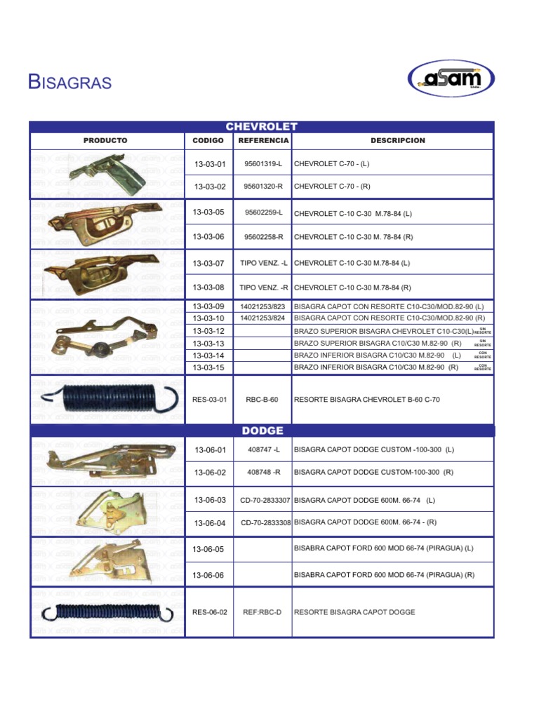 Este documento contiene un catálogo de productos de bisagras para vehículos de las marcas Chevrolet, Dodge y Ford, así como bisagras universales. Se lista el código, referencia y descripción de cada producto. También incluye referencias y descripciones de resortes para bisagras de diferentes vehículos.