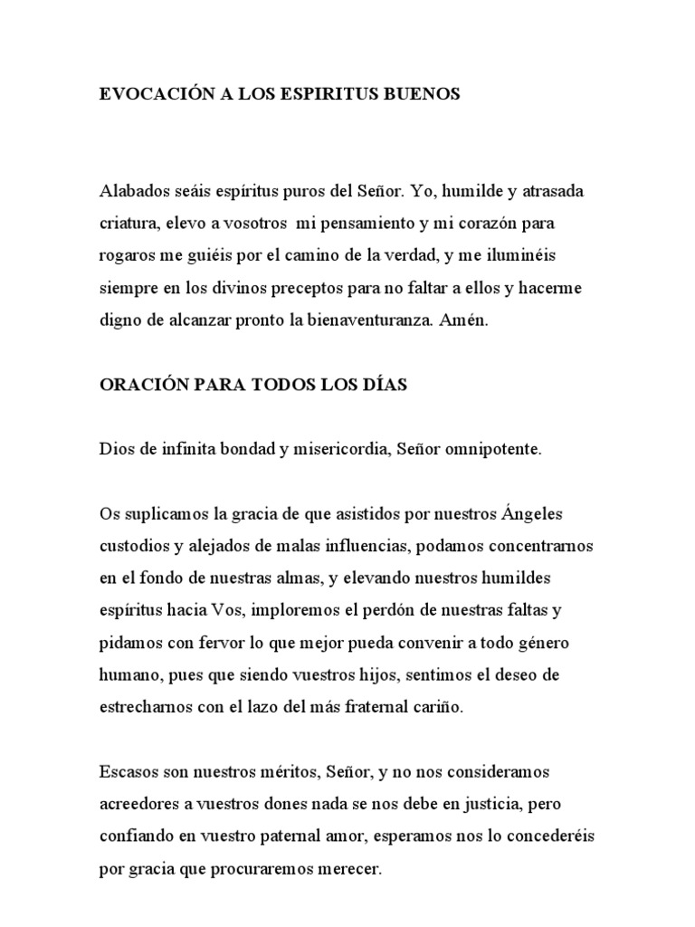Alabados seis espritus puros del Seor. Yo, humilde y atrasada criatura, elevo a vosotros mi pensamiento y mi corazn para rogaros me guiis por el camino de la verdad, y me iluminis siempre en los divinos preceptos para no faltar a ellos y hacerme digno de alcanzar pronto la bienaventuranza. Amn. ORACIN PARA TODOS LOS DAS Dios de infinita bondad y misericordia, Seor omnipotente. Os suplicamos la gracia de que asistidos por nuestros ngeles custodios y alejados de malas influencias, podamos concentrarnos en el fondo de nuestras almas, y elevando nuestros humildes espritus hacia Vos, imploremos el perdn de nuestras faltas y pidamos con fervor lo que mejor pueda convenir a todo gnero humano, pues que siendo vuestros hijos, sentimos el deseo de estrecharnos con el lazo del ms fraternal cario. Escasos son nuestros mritos, Seor, y no nos consideramos acreedores a vuestros dones nada se nos debe en justicia, pero confiando en vuestro paternal amor, esperamos nos lo concederis por gracia que procuraremos merecer.
