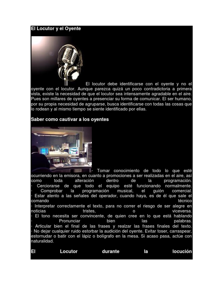 Tomar conocimiento de todo lo que est ocurriendo en la emisora, en cuanto a promociones a ser realizadas en el aire, as como toda alteracin dentro de la programacin. Cerciorarse de que todo el equipo est funcionando normalmente. Comprobar la programacin musical, el guin comercial. Estar atento a las seales del operador, cuando haya, es de l que sale el comando tcnico Interpretar correctamente el texto, para no correr el riesgo de ser alegre en noticias tristes, o viceversa. El tono necesita ser convincente, de quien cree en lo que est hablando Pronunciar bien las palabras. Articular bien el final de las frases y realzar las frases finales del texto. No dejar cualquier ruido estorbar la audicin del oyente. Evitar toser, carraspear, estornudar o batir con el lpiz o bolgrafo en la mesa. Si acaso pasa, acte con naturalidad.