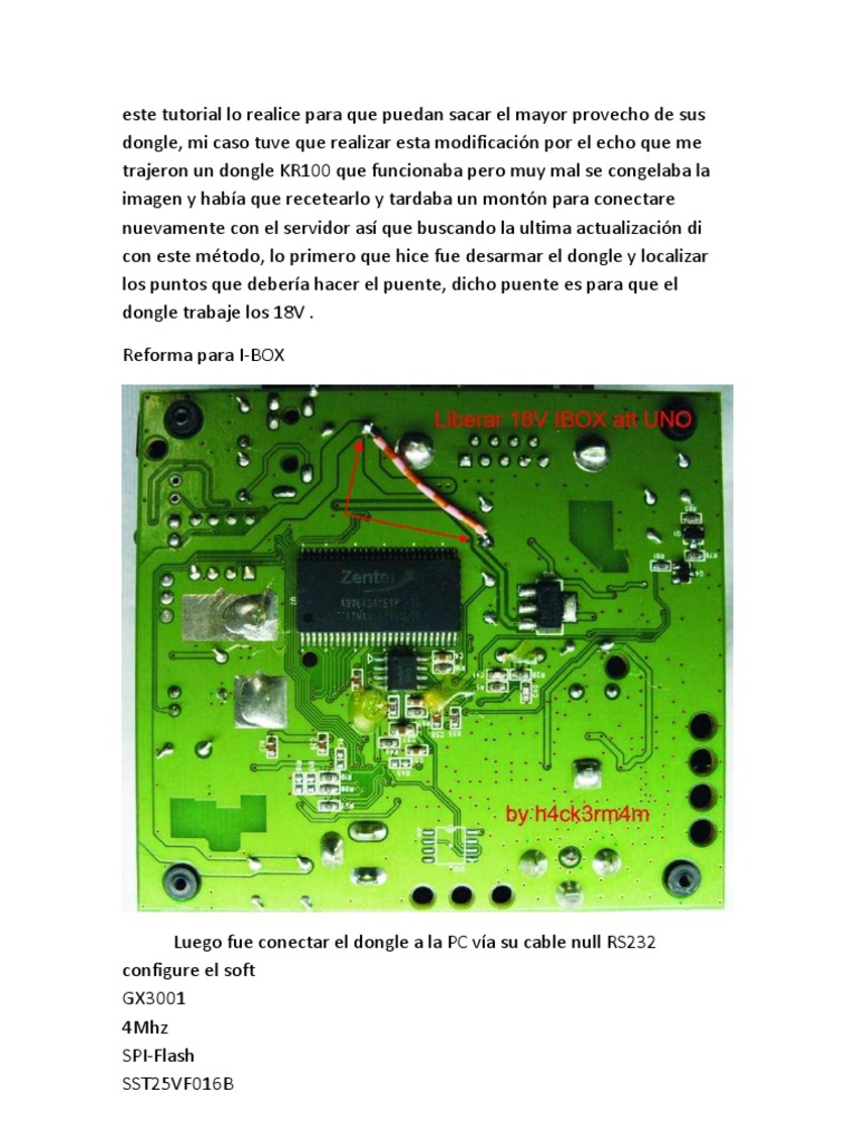 esta modificacin por el echo que me trajeron un dongle KR100 que funcionaba pero muy mal se congelaba la imagen y haba que recetearlo y tardaba un montn para conectare nuevamente con el servidor as que buscando la ultima actualizacin di con este mtodo, lo primero que hice fue desarmar el dongle y localizar los puntos que debera hacer el puente, dicho puente es para que el dongle trabaje los 18V . Reforma para I-BOX