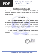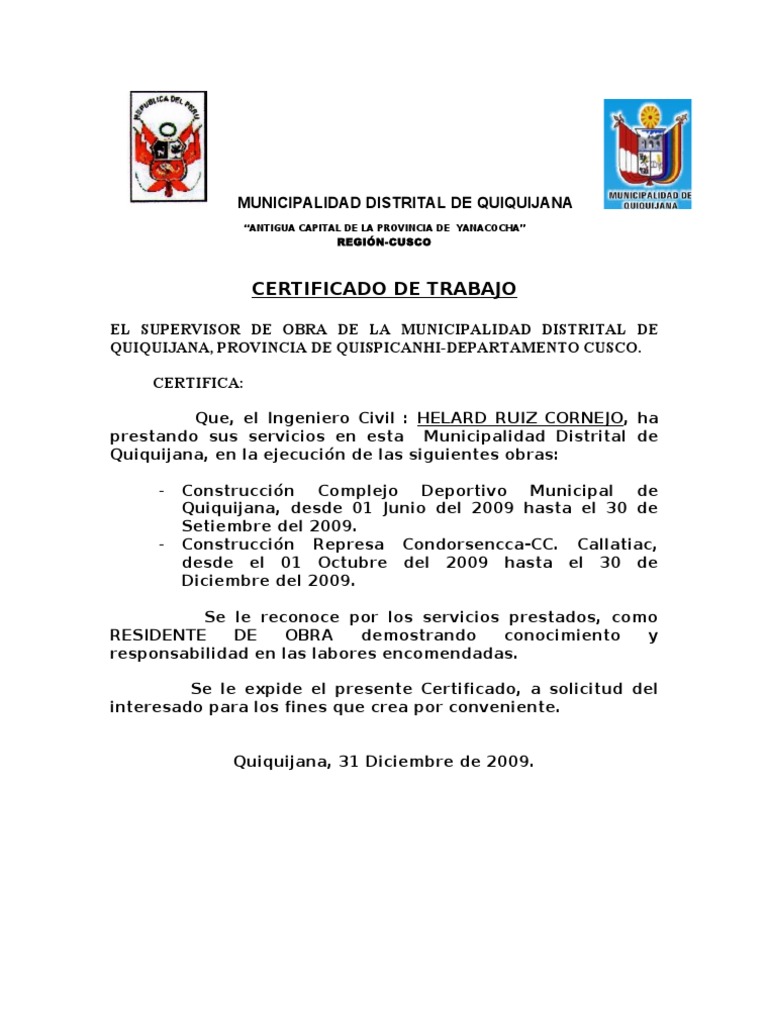 EL SUPERVISOR DE OBRA DE LA MUNICIPALIDAD DISTRITAL DE QUIQUIJANA, PROVINCIA DE QUISPICANHI-DEPARTAMENTO CUSCO. CERTIFICA: Que, el Ingeniero Civil : HELARD RUIZ CORNEJO, ha prestando sus servicios en esta Municipalidad Distrital de Quiquijana, en la ejecucin de las siguientes obras: Construccin Complejo Deportivo Municipal de Quiquijana, desde 01 Junio del 2009 hasta el 30 de Setiembre del 2009. Construccin Represa Condorsencca-CC. Callatiac, desde el 01 Octubre del 2009 hasta el 30 de Diciembre del 2009.