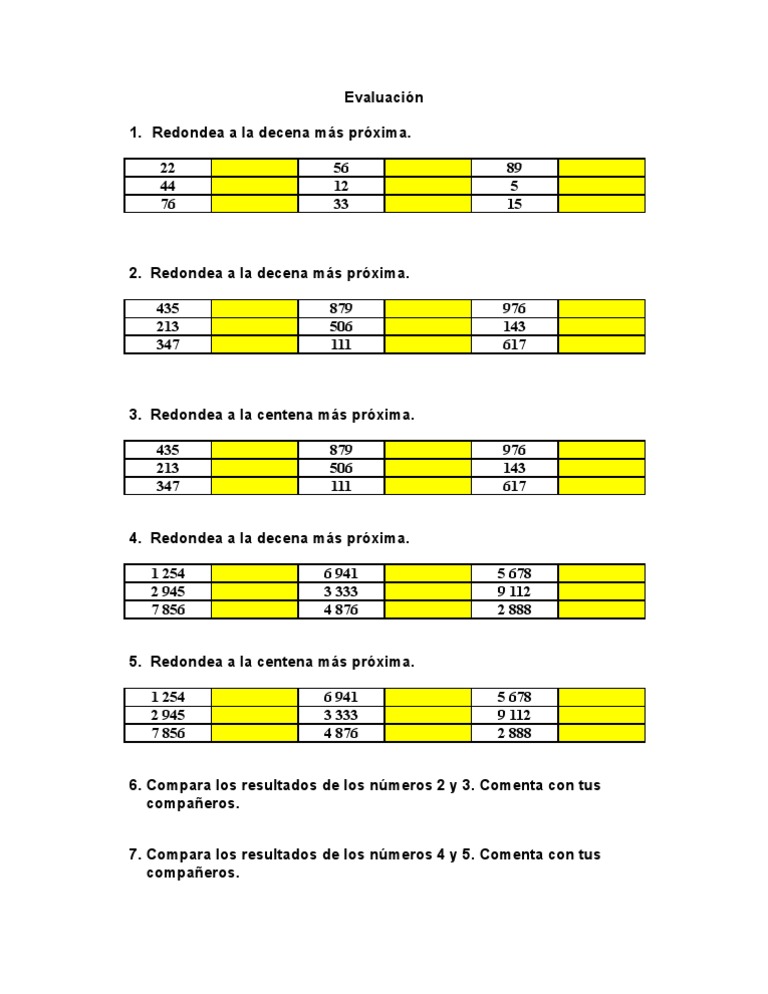 El documento presenta varios ejercicios de redondeo de números a la decena y centena más próxima. Los estudiantes deben redondear números individuales en las secciones 1-5 y comparar los resultados de las secciones pares e impares para comentar las diferencias con sus compañeros.