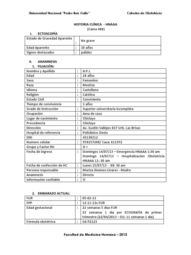 A.P.J. 28 aos Femenino Mestiza Castellano Catlica Conviviente 3 aos Superior universitaria incompleta Ama de casa Chiclayo Chiclayo Av. Gustin Vallejos 837 Urb. Las Brisas Policlnico Oeste 43130212 978157208/ Casa: 611972 O+ Domingos 14/07/13 Emergencia HNAAA 1:30 am Domingo 14/07/13 Hospitalizacin Obstetricia HNAAA 11: 30 am Lunes 15/07/13 - 08: 30 am Mariza Jimnez Linares - Madre Directa Si