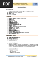 HISTORIA CLNICA - HNAAA (Cama 488) I. ECTOSCOPA Estado de Gravedad Aparente Edad Aparente Signos destacados II. ANAMNESIS 1. FILIACIN: Nombre y Apellido Edad Sexo Raza Idioma Religin Estado Civil Tiempo de convivencia Grado de instruccin Ocupacin Lugar de nacimiento Procedencia Direccin Hospital de referencia DNI Numero celular Grupo y Factor RH Fecha de ingreso : : : No grave 30 aos palidez