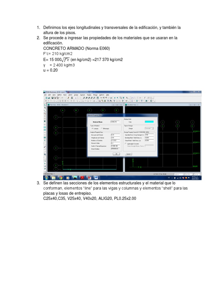 Se procede a ingresar las propiedades de los materiales que se usaran en la edificacin. CONCRETO ARMADO (Norma E060) Fc= 210 kg/cm2 E= 15 000 (en kg/cm2) =217 370 kg/cm2 = 2 400 kg/m3 u = 0.20