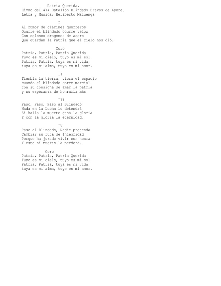 Patria Querida. Himno del 414 Batalln Blindado Bravos de Apure.