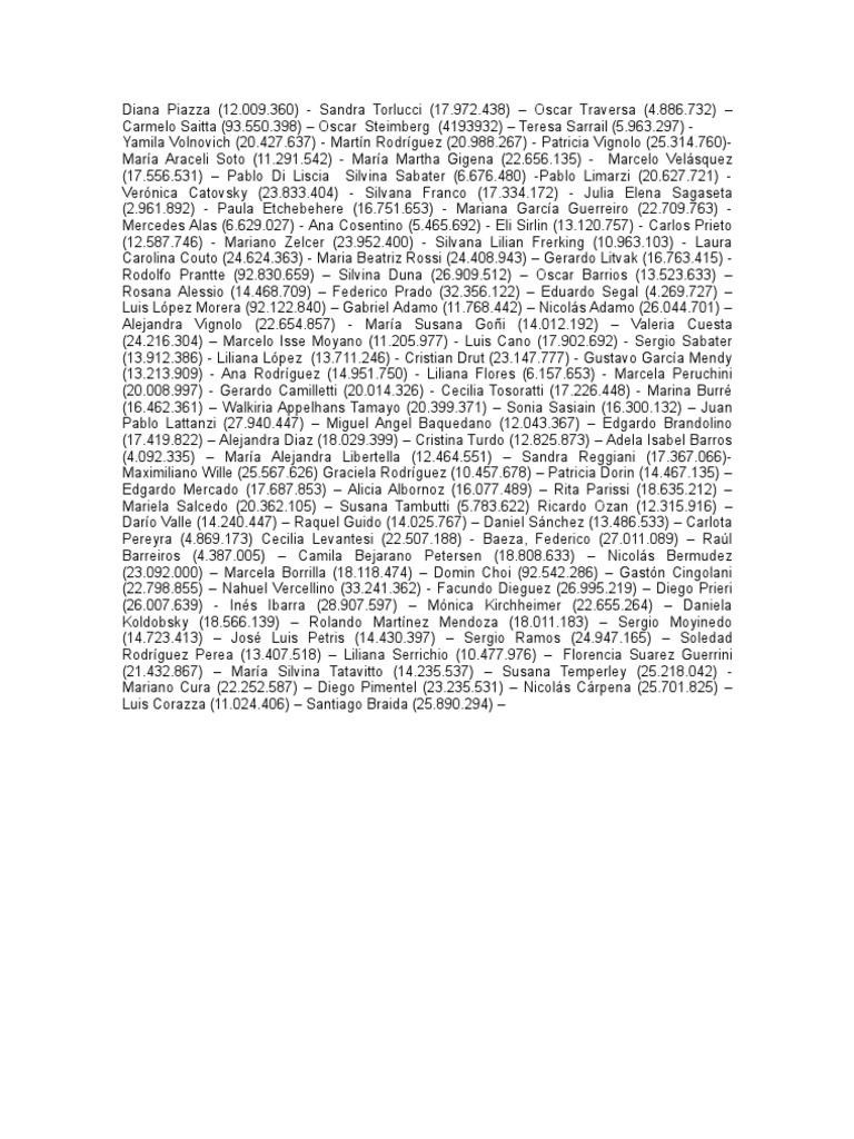 Rosana Alessio (14.468.709) – Federico Prado (32.356.122) – Eduardo Segal (4.269.727) –