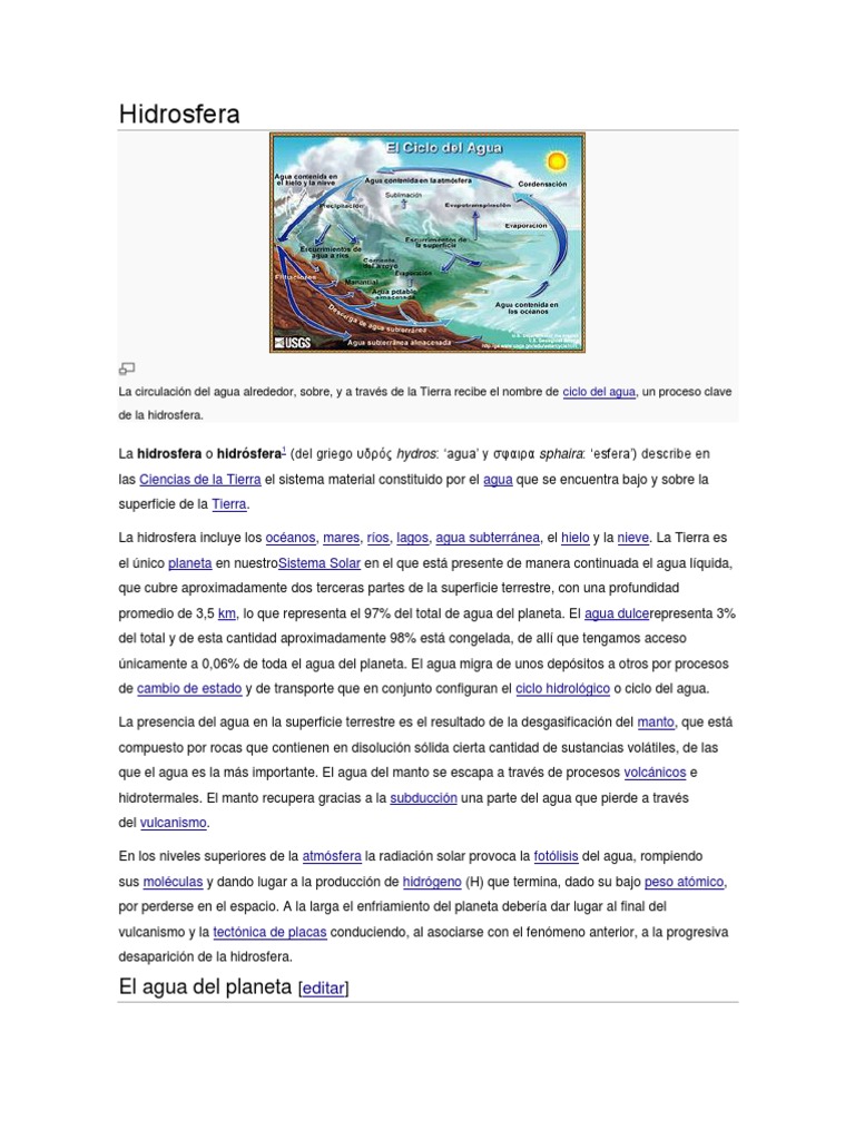 La hidrosfera o hidrsfera1 (del griego hydros: agua y sphaira: esfera) describe en las Ciencias de la Tierra el sistema material constituido por el agua que se encuentra bajo y sobre la superficie de la Tierra. La hidrosfera incluye los ocanos, mares, ros, lagos, agua subterrnea, el hielo y la nieve. La Tierra es el nico planeta en nuestroSistema Solar en el que est presente de manera continuada el agua lquida, que cubre aproximadamente dos terceras partes de la superficie terrestre, con una profundidad promedio de 3,5 km, lo que representa el 97% del total de agua del planeta. El agua dulcerepresenta 3% del total y de esta cantidad aproximadamente 98% est congelada, de all que tengamos acceso nicamente a 0,06% de toda el agua del planeta. El agua migra de unos depsitos a otros por procesos de cambio de estado y de transporte que en conjunto configuran el ciclo hidrolgico o ciclo del agua. La presencia del agua en la superficie terrestre es el resultado de la desgasificacin del manto, que est compuesto por rocas que contienen en disolucin slida cierta cantidad de sustancias voltiles, de las que el agua es la ms importante. El agua del manto se escapa a travs de procesos volcnicos e hidrotermales. El manto recupera gracias a la subduccin una parte del agua que pierde a travs del vulcanismo. En los niveles superiores de la atmsfera la radiacin solar provoca la fotlisis del agua, rompiendo sus molculas y dando lugar a la produccin de hidrgeno (H) que termina, dado su bajo peso atmico, por perderse en el espacio. A la larga el enfriamiento del planeta debera dar lugar al final del vulcanismo y la tectnica de placas conduciendo, al asociarse con el fenmeno anterior, a la progresiva desaparicin de la hidrosfera.