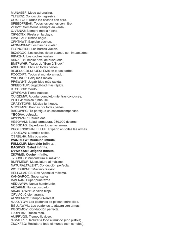 GHOSTTOWN: Trfico reducido. IOJUFZN: Modo reyerta. CWJXUOC: Tormenta de arena. BRINGITON: Nivel de bsqueda de seis estrellas. KVGYZQK: Delgado. SLOWITDOWN: Cmara lenta. BEKKNQV: Imn. JCNRUAD: Smash n' Boom CQZIJMB: Generar Bloodring Banger RZHSUEW: Generar Caddy EEGCYXT: Generar Dozer ITSALLBULL: Generar Dozer OHDUDE: Generar Hunter JUMPJET: Generar Hydra AGBDLCID: Generar Monster MONSTERMASH: Generar Monster AKJJYGLC: Generar Quad PDNEJOH: Generar Racecar VPJTQWV: Generar Racecar JQNTDMH: Generar Rancher AIWPRTON: Generar Rhino AQTBCODX: Generar Romero KRIJEBR: Generar Stretch CELEBRITYSTATUS: Generar Stretch URKQSRK: Generar Stunt Plane AMOMHRER: Generar Tanker Truck UBHYZHQ: Generar Trashmaster TRUEGRIME: Generar Trashmaster KGGGDKP: Generar Vortex Hovercraft SZCMAWO: Suicidio. AFZLLQLL: Soleado. VKYPQCF: Los coches saltan. MGHXYRM: Tormenta de [Link] BGKGTJH: Los coches son utilitarios. FVTMNBZ: Los coches son vehculos country. GUSNHDE: Los coches son deportivos. ICIKPYH: Muy soleado. LXGIWYL: Armas 1. KJKSZPJ: Armas 2. UZUMYMW: Armas 3.