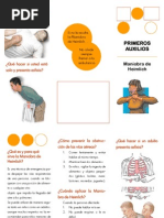 METODO: Tenemos dos personas una la vctima (con el problema) y otra el auxiliar (el que ejecuta la maniobra de Heimlich). La vctima puede estar de pies o sentada, el auxiliar se pondr de pies y por detrs, cogiendo en un abrazo a nivel de la cintura de la vctima. El auxiliar coloca una mano plegada como un puo a nivel del abdomen de la vctima, y con la otra mano se coge la mueca de la mano anterior. En esta posicin es fcil que al realizar presiones intensas en forma de abrazo, la vctima sea levantada en la maniobra, pero es incluso recomendable. Se deben repetir presiones intensas hasta que el objeto causante del problema sea expulsado por la boca. MANIOBRA DE HEIMLICH EN NIOS CONSCIENTES: Incapacidad para respirar debido a un bloqueo de las vas respiratorias. Todas las vctimas de asfixia deben recibir atencin mdica, dado que las complicaciones pueden surgir no slo a consecuencia del incidente, sino tambin de las medidas de primeros auxilios que se tomen. Ocasionalmente, hay objetos que entran en los pulmones en lugar de ser expulsados. Aunque puede parecer que la vctima mejora y respira con normalidad, en pocos das pueden aparecer seales y sntomas como jadeos, tos persistente y neumona, los cuales indican que un objeto extrao est alojado en los pulmones. Si esto sucede, se debe buscar asistencia mdica inmediata. Normalmente, la asfixia en los nios es provocada por la inhalacin o ingestin de un objeto extrao. Para ver el grfico seleccione la opcin "Descargar" del men superior MANIOBRA DE HEIMLICH EN PERSONAS MAYORES DE 1 AO CONSCIENTES: Interrupcin u obstaculizacin de la respiracin por una obstruccin o irritacin de la trquea. La asfixia es la forma en que el cuerpo trata de eliminar de la trquea un objeto extrao, como un alimento. Las vas respiratorias de una persona pueden ser bloqueadas total o parcialmente. Una obstruccin total es una condicin que atenta contra la vida del individuo; la obstruccin parcial