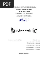 DESCRIPCION: En algunas ocasiones el paciente puede presentar una obstruccin de las vas areas por algn cuerpo extrao que le imposibilita el paso del aire. Dicha obstruccin puede ser completa, en cuyo caso no entra ni sale aire, o bien, incompleta o parcial, en el que el paso de aire an existe, aunque en muy pequea cantidad. La sospecha de una obstruccin completa depende del estado del paciente: Si est consciente, la persona se lleva las manos a la garganta y la cara se congestiona, no pudiendo hablar, toser o respirar. Si est inconsciente, no lograremos que penetre aire en su cavidad torcica al realizar el boca a boca. En este caso deberemos asegurarnos que hemos realizado la apertura de la va area de forma correcta antes de intentar otra maniobra. Si la obstruccin es incompleta y el paciente es capaz de toser, le animaremos a que lo haga. Si es completa no va a poder inspirar el aire suficiente como para toser. En este caso le practicaremos la Maniobra de Heimlich, tambin llamada "del abrazo del oso", que consiste en provocarle un brusco aumento de la presin dentro del trax para que pueda expulsar el cuerpo extrao. Para ello: Si est consciente, nos situaremos detrs y colocando el puo en la boca de su estmago y sujetndonoslo con la otra mano, comprimiremos bruscamente hacia arriba y hacia nosotros, tratando de aumentar la presin en los pulmones. Repetiremos la maniobra 5 6 veces hasta que veamos como expulsa el objeto. Si est inconsciente realizaremos la misma maniobra con el paciente en el suelo