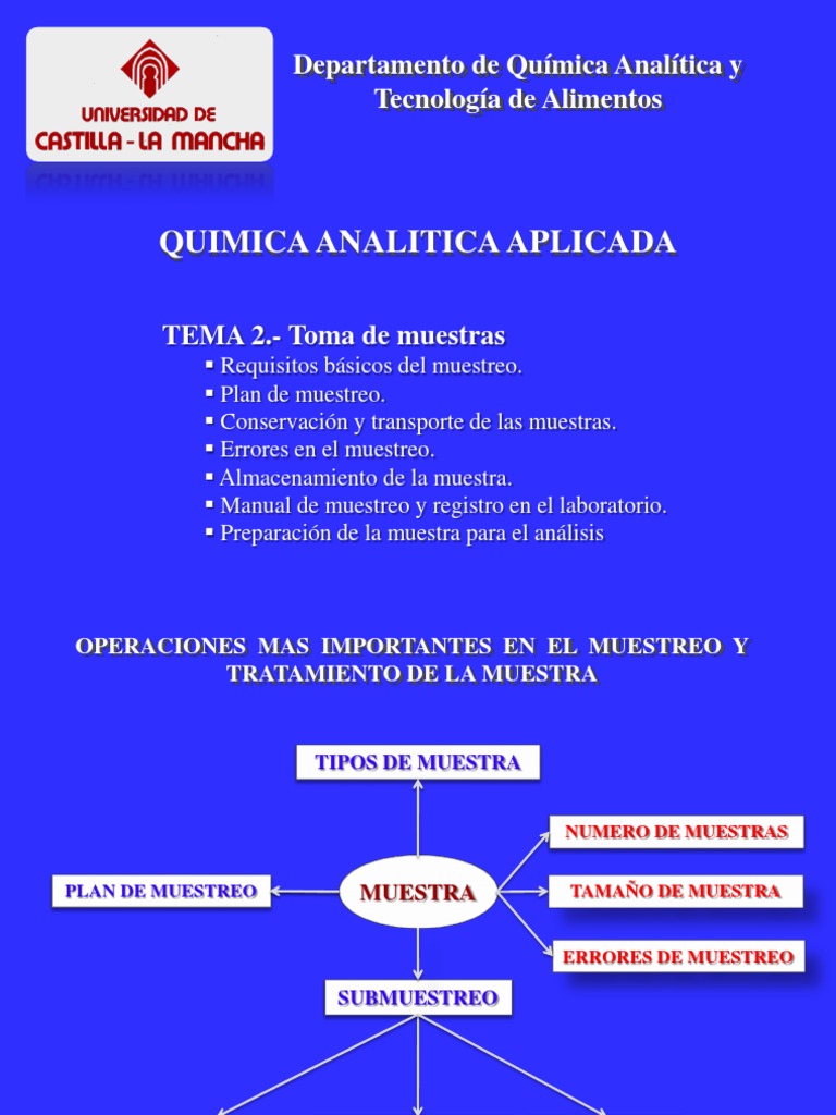 Proceso de seleccin de una porcin de material que represente o proporcione informacin sobre el sistema en estudio (poblacin). Concepto amplio : Recogida de la muestra. Conservacin. Reduccin del tamao de partcula. Homogeneizacin. Submuestreo. Uno de los aspectos mas importantes para obtener resultados de calidad en un anlisis es disponer de una muestra que represente el lote que se va a analizar . Es fundamental conocer e identificar los errores que se pueden cometer en el proceso y durante la manipulacin de la muestra hasta que llega al laboratorio. La mayora de las tcnicas analticas requieren disponer de la muestra en disolucin, por lo que abordaremos los tratamientos qumicos mas importantes y los posibles errores que se puedan cometer para obtener una disolucin que represente a la muestra. (tratamiento de la muestra). ETAPAS DEL MUESTREO Identificacin de la poblacin Toma de una muestra bruta