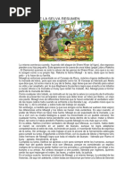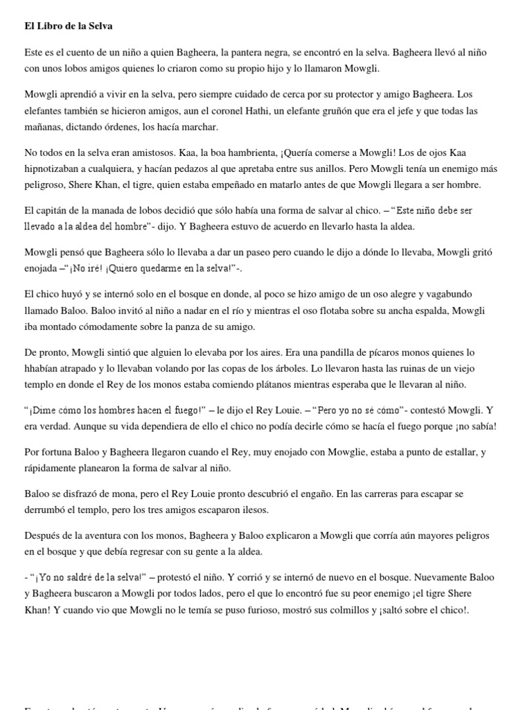 Bagheera llev al nio con unos lobos amigos quienes lo criaron como su propio hijo y lo llamaron Mowgli. Mowgli aprendi a vivir en la selva, pero siempre cuidado de cerca por su protector y amigo Bagheera. Los elefantes tambin se hicieron amigos, aun el coronel Hathi, un elefante grun que era el jefe y que todas las maanas, dictando rdenes, los haca marchar. No todos en la selva eran amistosos. Kaa, la boa hambrienta, Quera comerse a Mowgli! Los de ojos Kaa hipnotizaban a cualquiera, y hacan pedazos al que apretaba entre sus anillos. Pero Mowgli tena un enemigo ms peligroso, Shere Khan, el tigre, quien estaba empeado en matarlo antes de que Mowgli llegara a ser hombre. El capitn de la manada de lobos decidi que slo haba una forma de salvar al chico. Este nio debe ser llevado a la aldea del hombre- dijo. Y Bagheera estuvo de acuerdo en llevarlo hasta la aldea. Mowgli pens que Bagheera slo lo llevaba a dar un paseo pero cuando le dijo a dnde lo llevaba, Mowgli grit enojada No ir! Quiero quedarme en la selva!-. El chico huy y se intern solo en el bosque en donde, al poco se hizo amigo de un oso alegre y vagabundo llamado Baloo. Baloo invit al nio a nadar en el ro y mientras el oso flotaba sobre su ancha espalda, Mowgli iba montado cmodamente sobre la panza de su amigo. De pronto, Mowgli sinti que alguien lo elevaba por los aires. Era una pandilla de pcaros monos quienes lo hhaban atrapado y lo llevaban volando por las copas de los rboles. Lo llevaron hasta las ruinas de un viejo templo en donde el Rey de los monos estaba comiendo pltanos mientras esperaba que le llevaran al nio. Dime cmo los hombres hacen el fuego! le dijo el Rey Louie. Pero yo no s cmo- contest Mowgli. Y era verdad. Aunque su vida dependiera de ello el chico no poda decirle cmo se haca el fuego porque no saba! Por fortuna Baloo y Bagheera llegaron cuando el Rey, muy enojado con Mowglie, estaba a punto de estallar, y rpidamente planearon la forma de salvar al nio. Baloo se disfraz de mona, pero el Rey Louie pronto descubri el engao. En las carreras para escapar se derrumb el templo, pero los tres amigos escaparon ilesos. Despus de la aventura con los monos, Bagheera y Baloo explicaron a Mowgli que corra an mayores peligros en el bosque y que deba regresar con su gente a la aldea. - Yo no saldr de la selva! protest el nio. Y corri y se intern de nuevo en el bosque. Nuevamente Baloo y Bagheera buscaron a Mowgli por todos lados, pero el que lo encontr fue su peor enemigo el tigre Shere Khan! Y cuando vio que Mowgli no le tema se puso furioso, mostr sus colmillos y salt sobre el chico!.