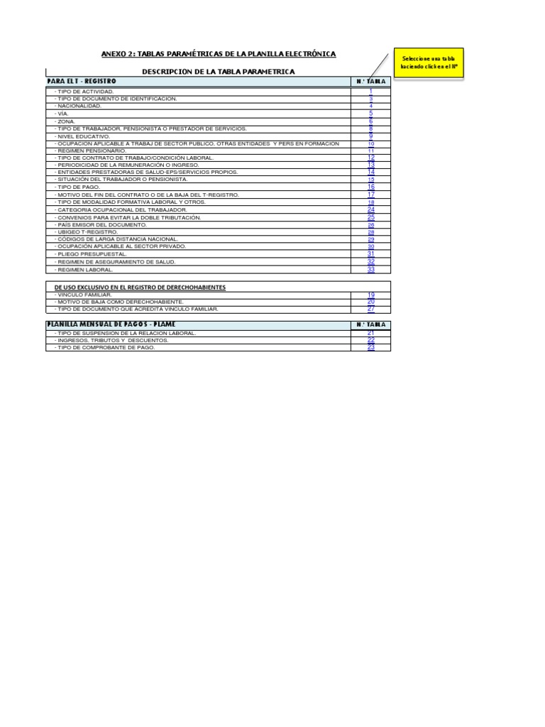 - TIPO DE ACTIVIDAD. - TIPO DE DOCUMENTO DE IDENTIFICACIN. - NACIONALIDAD. - VA. - ZONA. - TIPO DE TRABAJADOR, PENSIONISTA O PRESTADOR DE SERVICIOS. - NIVEL EDUCATIVO. - OCUPACIN APLICABLE A TRABAJ DE SCTOR PBLICO, OTRAS ENTIDADES Y PERS EN FORMACIN - RGIMEN PENSIONARIO. - TIPO DE CONTRATO DE TRABAJO/CONDICIN LABORAL. - PERIODICIDAD DE LA REMUNERACIN O INGRESO. - ENTIDADES PRESTADORAS DE SALUD-EPS/SERVICIOS PROPIOS. - SITUACIN DEL TRABAJADOR O PENSIONISTA. - TIPO DE PAGO. - MOTIVO DEL FIN DEL CONTRATO O DE LA BAJA DEL T-REGISTRO. - TIPO DE MODALIDAD FORMATIVA LABORAL Y OTROS. - CATEGORIA OCUPACIONAL DEL TRABAJADOR. - CONVENIOS PARA EVITAR LA DOBLE TRIBUTACIN. - PAS EMISOR DEL DOCUMENTO. - UBIGEO T-REGISTRO. - CDIGOS DE LARGA DISTANCIA NACIONAL. - OCUPACIN APLICABLE AL SECTOR PRIVADO. - PLIEGO PRESUPUESTAL. - REGIMEN DE ASEGURAMIENTO DE SALUD. - REGIMEN LABORAL.