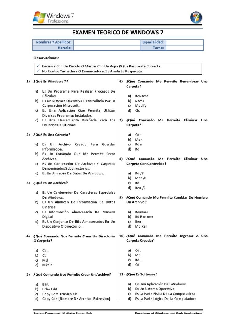 1) Qu Es Windows 7? a) Es Un Programa Para Realizar Procesos De Clculos b) Es Un Sistema Operativo Desarrollado Por La Corporacin Microsoft. c) Es Una Aplicacin Que Permite Utilizar Diversos Programas Instalados. d) Es Una Herramienta Diseada Para Los Usuarios De Oficinas. 2) Qu Es Una Carpeta? a) Es Un Archivo Creado Para Guardar Informacin. b) Es Un Comando Que Me Permite Crear Archivos. c) Es Un Contenedor De Archivos Y Carpetas Denominados Subdirectorios. d) Es Un Almacn De Datos De Windows. 3) Qu Es Un Archivo? a) Es Un Contenedor De Caracteres Especiales De Windows. b) Es Un Almacn De Informacin De Datos Binarios. c) Es Informacin Almacenada De Manera Digital. d) Es Un Conjunto De Bits Almacenados En Un Dispositivo O Directorio. 4) Qu Comando Nos Permite Crear Un Directorio O Carpeta? a) b) c) d) Cd.. Cd Md Mkdir 6) Qu Comando Me Permite Renombrar Una Carpeta? a) b) c) d) ReName Name Modify Cls