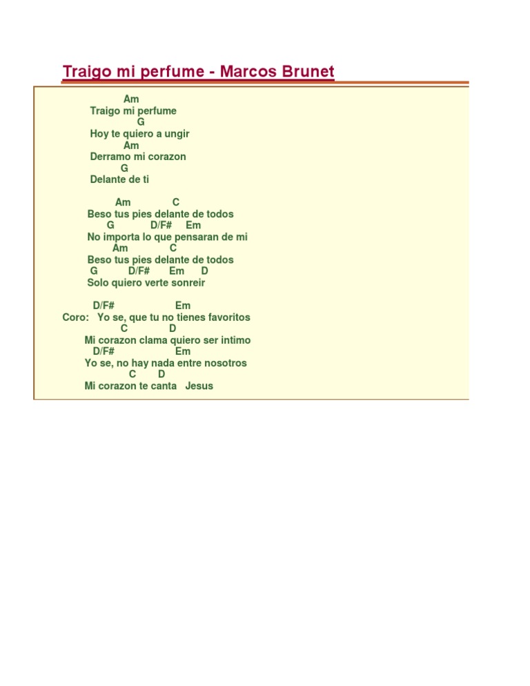 Am Traigo mi perfume G Hoy te quiero a ungir Am Derramo mi corazon G Delante de ti Am C Beso tus pies delante de todos G D/F# Em No importa lo que pensaran de mi Am C Beso tus pies delante de todos G D/F# Em D Solo quiero verte sonreir D/F# Em Coro: Yo se, que tu no tienes favoritos C D Mi corazon clama quiero ser intimo D/F# Em Yo se, no hay nada entre nosotros C D Mi corazon te canta Jesus