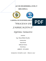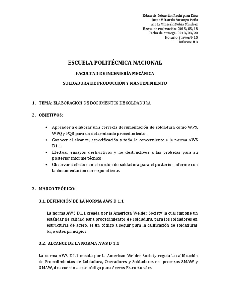 1. TEMA: ELABORACIN DE DOCUMENTOS DE SOLDADURA 2. OBJETIVOS: Aprender a elaborar una correcta documentacin de soldadura como WPS, WPQ y PQR para un determinado procedimiento. Conocer el alcance, especificacin y todo lo concerniente a la norma AWS D1.1. Efectuar ensayos destructivos y no destructivos a las probetas para su posterior informe tcnico. Observar defectos en el cordn de soldadura para el posterior informe con la documentacin correspondiente.