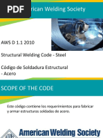 3. MARCO TERICO: 3.1. DEFINICIN DE LA NORMA AWS D 1.1 La norma AWS D1.1 creada por la American Welder Society la cual impone un estndar de calidad para procedimientos de soldadura, para los soldadores en estructuras de acero, es un cdigo a seguir para la calificacin de soldaduras bajo estos principios 3.2. ALCANCE DE LA NORMA AWS D 1.1 La norma AWS D1.1 creada por la American Welder Society regula la calificacin de Procedimientos de Soldadura, Operadores y Soldadores en procesos SMAW y GMAW, de acuerdo a este cdigo para Aceros Estructurales