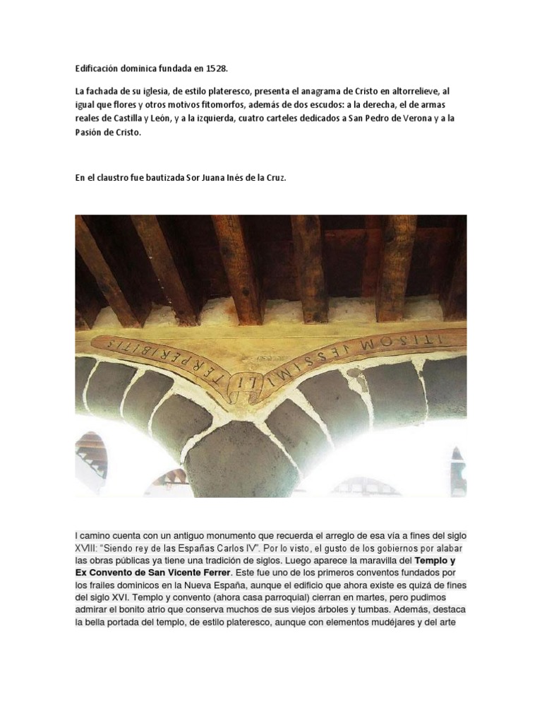l camino cuenta con un antiguo monumento que recuerda el arreglo de esa va a fines del siglo XVIII: Siendo rey de las Espaas Carlos IV. Por lo visto, el gusto de los gobiernos por alabar las obras pblicas ya tiene una tradicin de siglos. Luego aparece la maravilla del Templo y Ex Convento de San Vicente Ferrer. Este fue uno de los primeros conventos fundados por los frailes dominicos en la Nueva Espaa, aunque el edificio que ahora existe es quiz de fines del siglo XVI. Templo y convento (ahora casa parroquial) cierran en martes, pero pudimos admirar el bonito atrio que conserva muchos de sus viejos rboles y tumbas. Adems, destaca la bella portada del templo, de estilo plateresco, aunque con elementos mudjares y del arte