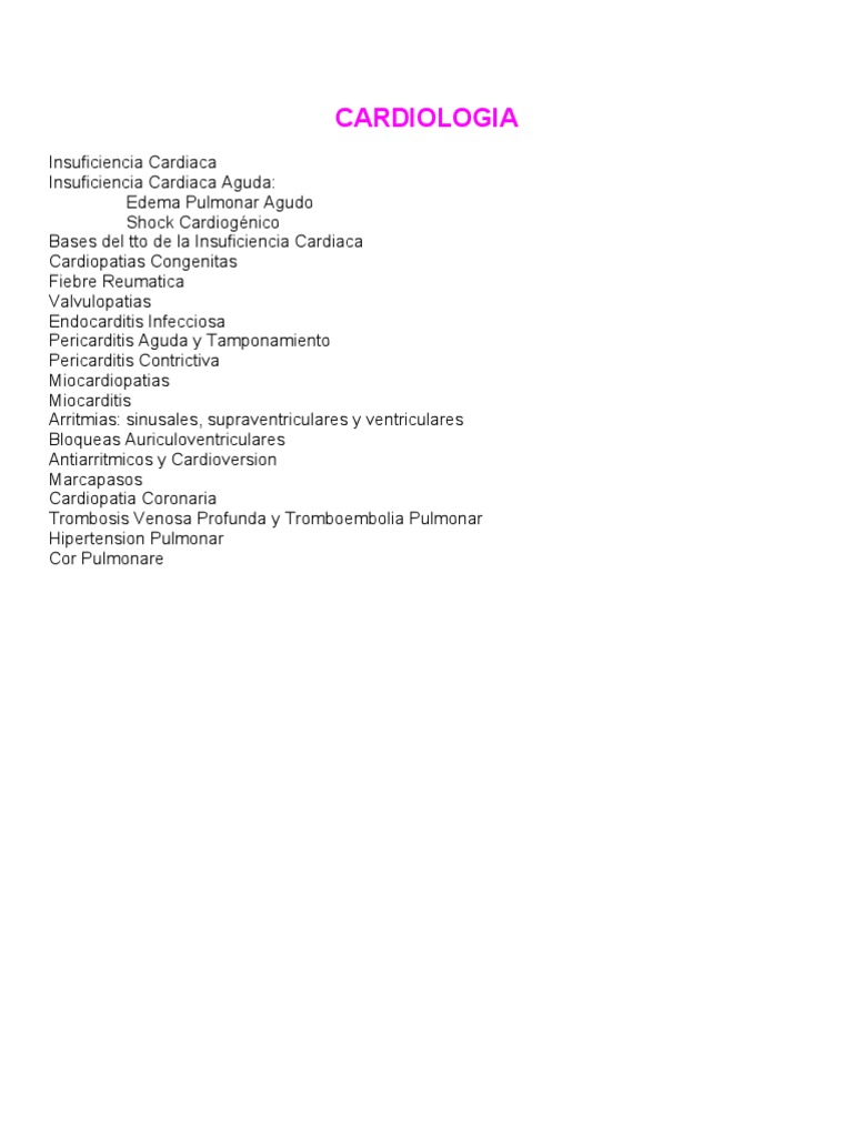 Insuficiencia Cardiaca Insuficiencia Cardiaca Aguda: Edema Pulmonar Agudo Shock Cardiognico Bases del tto de la Insuficiencia Cardiaca Cardiopatias Congenitas Fiebre Reumatica Valvulopatias Endocarditis Infecciosa Pericarditis Aguda y Tamponamiento Pericarditis Contrictiva Miocardiopatias Miocarditis Arritmias: sinusales, supraventriculares y ventriculares Bloqueas Auriculoventriculares Antiarritmicos y Cardioversion Marcapasos Cardiopatia Coronaria Trombosis Venosa Profunda y Tromboembolia Pulmonar Hipertension Pulmonar Cor Pulmonare