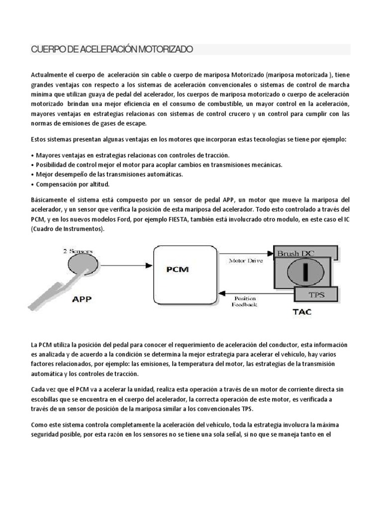 Actualmente el cuerpo de aceleracin sin cable o cuerpo de mariposa Motorizado (mariposa motorizada ), tiene grandes ventajas con respecto a los sistemas de aceleracin convencionales o sistemas de control de marcha mnima que utilizan guaya de pedal del acelerador, los cuerpos de mariposa motorizado o cuerpo de aceleracin motorizado brindan una mejor eficiencia en el consumo de combustible, un mayor control en la aceleracin, mayores ventajas en estrategias relacionas con sistemas de control crucero y un control para cumplir con las normas de emisiones de gases de escape. Estos sistemas presentan algunas ventajas en los motores que incorporan estas tecnologas se tiene por ejemplo: Mayores ventajas en estrategias relacionas con controles de traccin. Posibilidad de control mejor el motor para acoplar cambios en transmisiones mecnicas. Mejor desempeo de las transmisiones automticas. Compensacin por altitud. Bsicamente el sistema est compuesto por un sensor de pedal APP, un motor que mueve la mariposa del acelerador, y un sensor que verifica la posicin de esta mariposa del acelerador. Todo esto controlado a travs del PCM, y en los nuevos modelos Ford, por ejemplo FIESTA, tambin est involucrado otro modulo, en este caso el IC (Cuadro de Instrumentos).